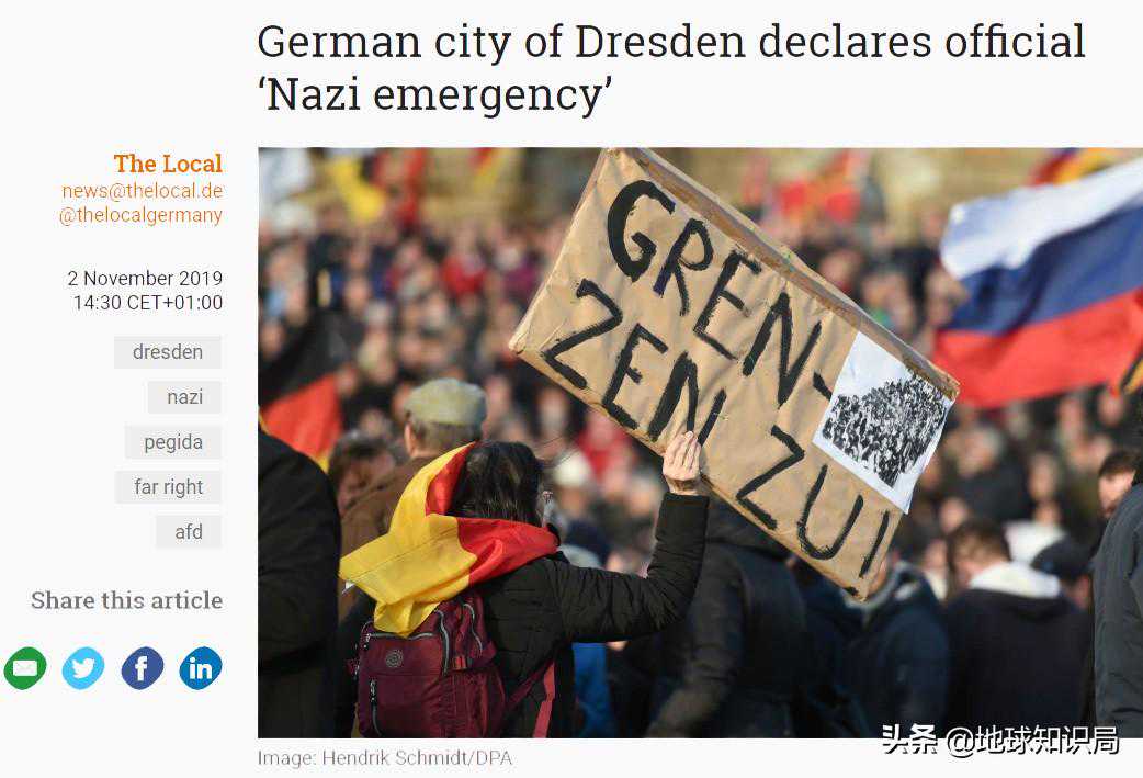 11月3日,德国东部城市德累斯顿传出消息,全城进入“纳粹紧急状态”,用以提醒人们注意这座城市里逐渐抬头的纳粹主义者和正在增强的极右翼恶性势力。
