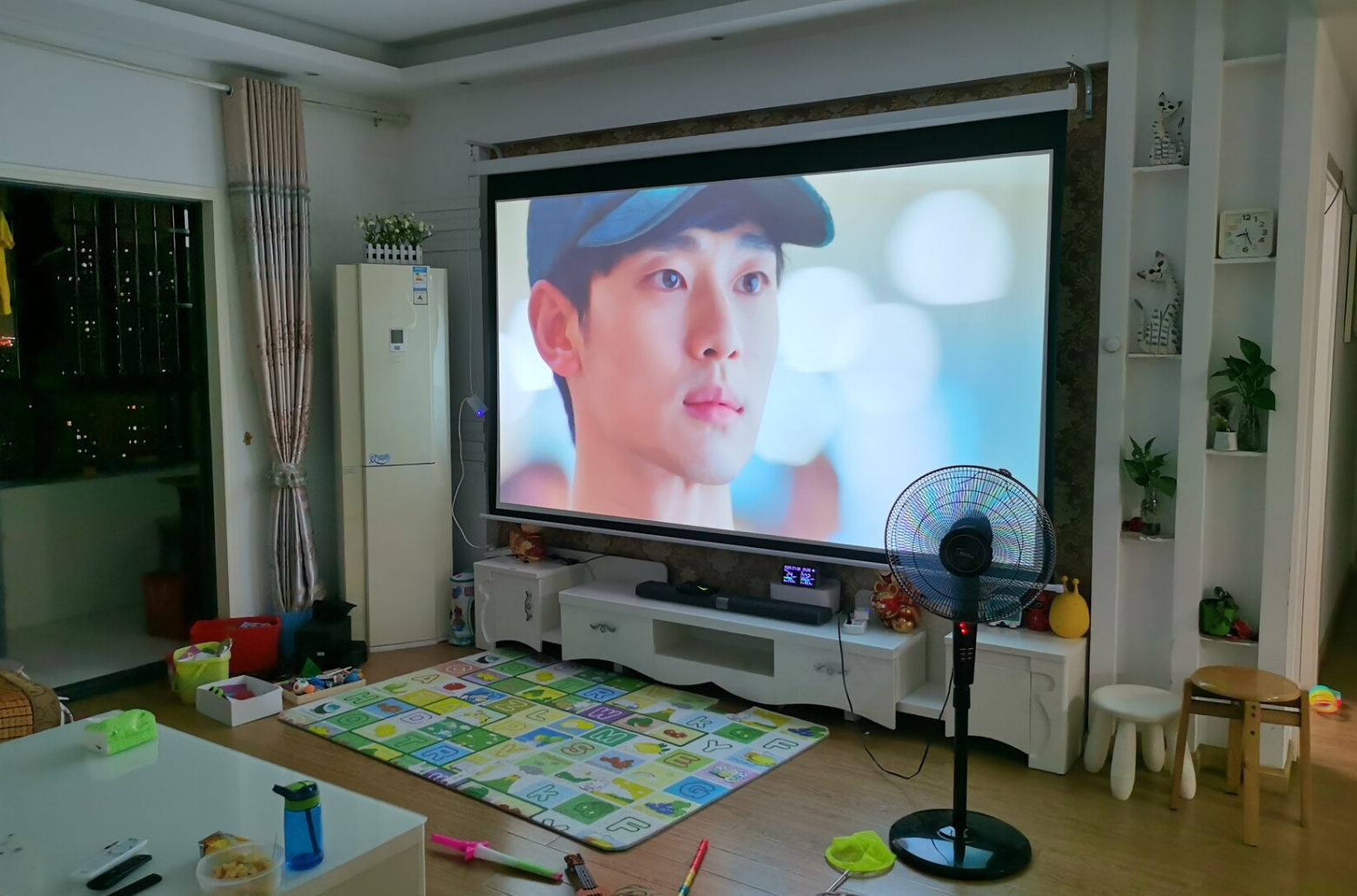 1、虽然是白墙,投射的投影画面,真的很清晰,但是每次看电视都需要坐在地上看,难免有点奇怪,电动幕布肯定是要买了: