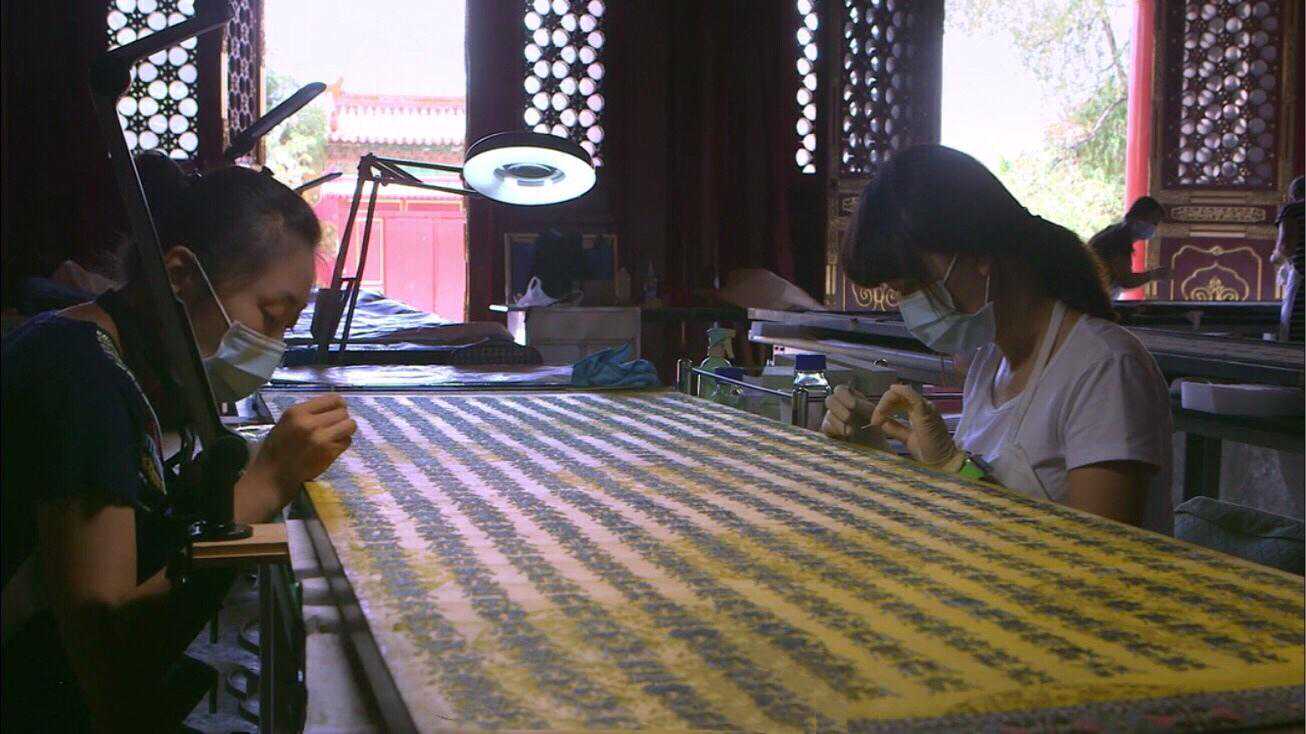 文物修复部门青铜、木器、漆器、镶嵌、书画和织绣等多个工艺组合,故宫在继承传统修复技艺的同时,也开始借助现代科学理念和技术的运用,纺织品修复过程中需要借助现代仪器检测分析,修复文物,是穿越古今,与百年之前的人进行对话的一种特殊职业和特殊生命体验,与我们想象中气氛肃穆,战战兢兢面对文物不同,修复国之瑰宝的现场,其实大多数都是轻描淡写,显得很日常化。
