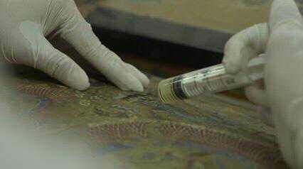 修复屏风时遇到了很多困难,比如木头收缩形成裂缝,如果只是单纯的让缝隙变严,则会改变屏风原有尺寸,所以为了不改变它的尺寸,只能在缝隙中摘嵌条,保证了之前文物不再动它,只是再给它附加了一部分,相当于是可逆的一部分,还会遇到木材生虫、发黒霉、对于屏风的清理等诸多问题。