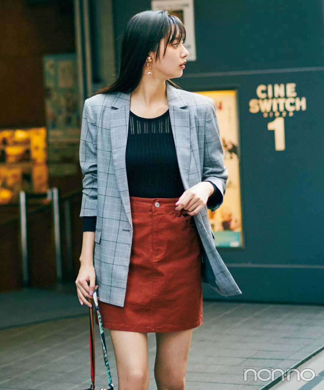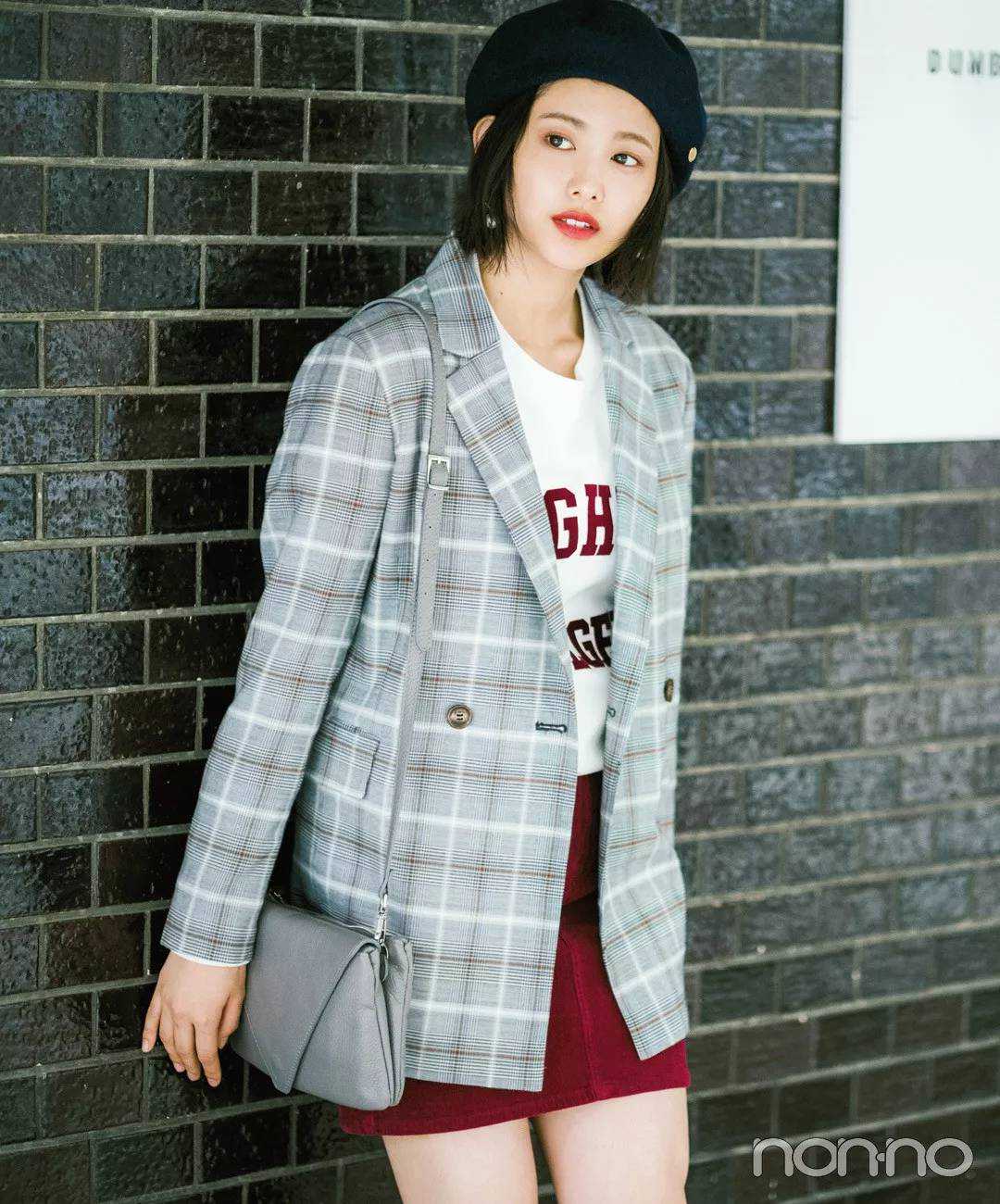 人气的格纹西装夹克,与灯芯绒迷你半裙结合,甜美穿搭中和中性风魅力的首推!内搭上衣选深色的令整体印象沉稳,打造帅气Girly风。