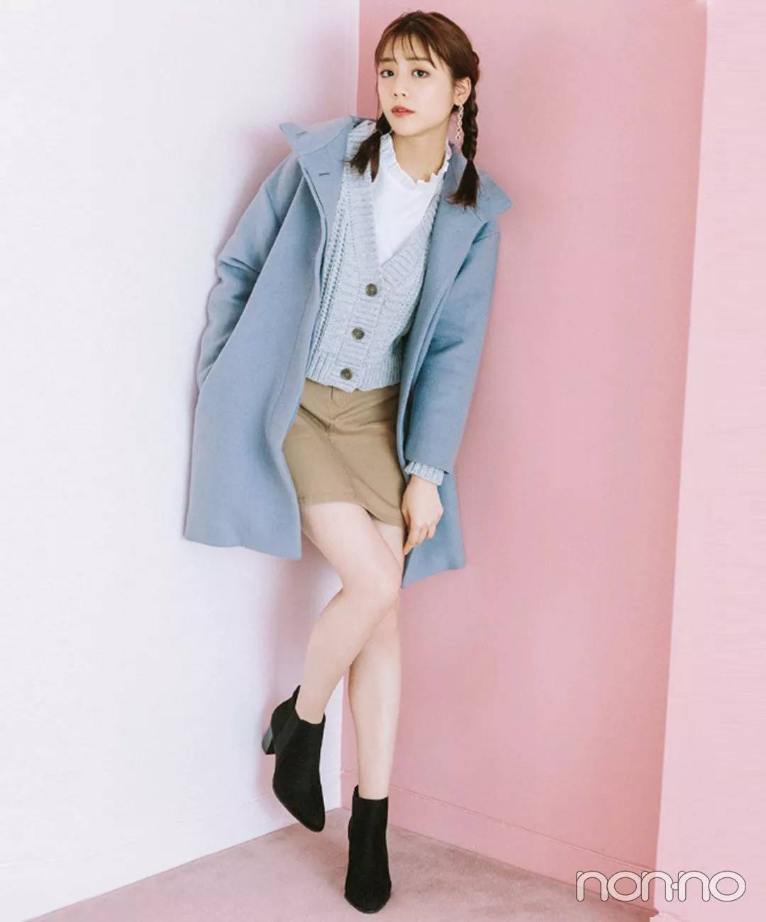 针织开衫¥2900/RETROGIRL大衣¥9990/UNIQLO衬衫¥5815/3rdSpring半裙¥1990/WEGO耳环¥2278/ROOM短靴¥8300/RANDA