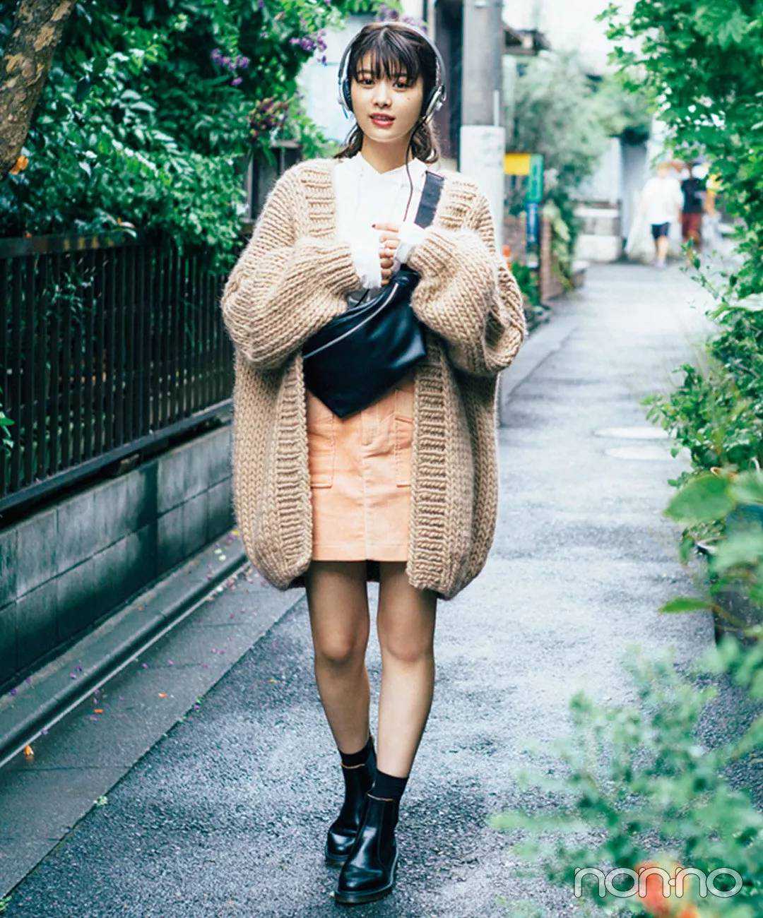 蓬松柔软的针织开衫外套主役,套头上衣和粉色台型迷你裙,整套配色的柔和感,很受男生欢迎的一套。