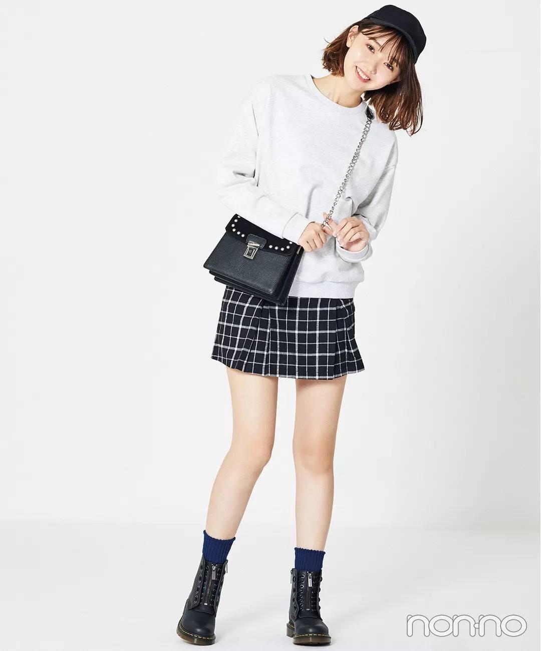 鞋子¥13500/DIANA銀座本店短袜¥800/B短靴¥23000/DIANA銀座本店londoll上衣¥6000/BEAMSWOMEN半裙¥3695/ZARA包包¥37000/ADINAMUSE耳环¥1600/ゴールディ