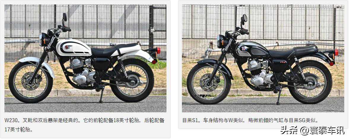 发动机部件经过重新设计,看起来更为庞大,特别是曲轴箱盖的曲线设计,强调了复古美感。车架方面,W230和目黑S1采用了单个支架框架,强调复古风格。