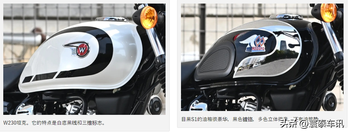 接下来我总结一下两款车的区别。两款车的基本配置相同,但在颜色、徽章、仪表盘和座椅等方面有所区别。W230的油箱特点是白底黑线和三维标志,而目黑S1的油箱则采用了黑色镀铬和多色立体徽章,更显豪华。