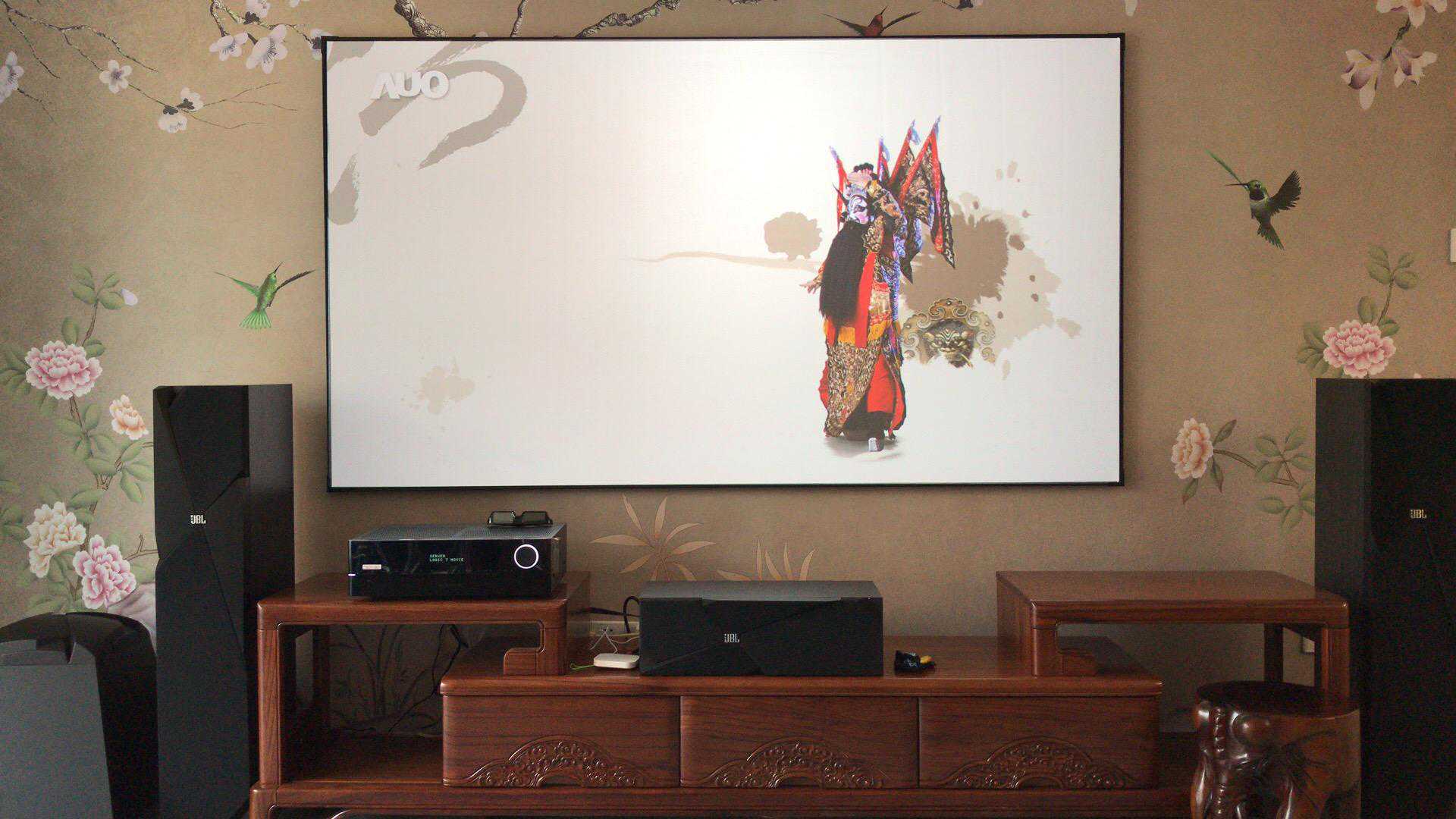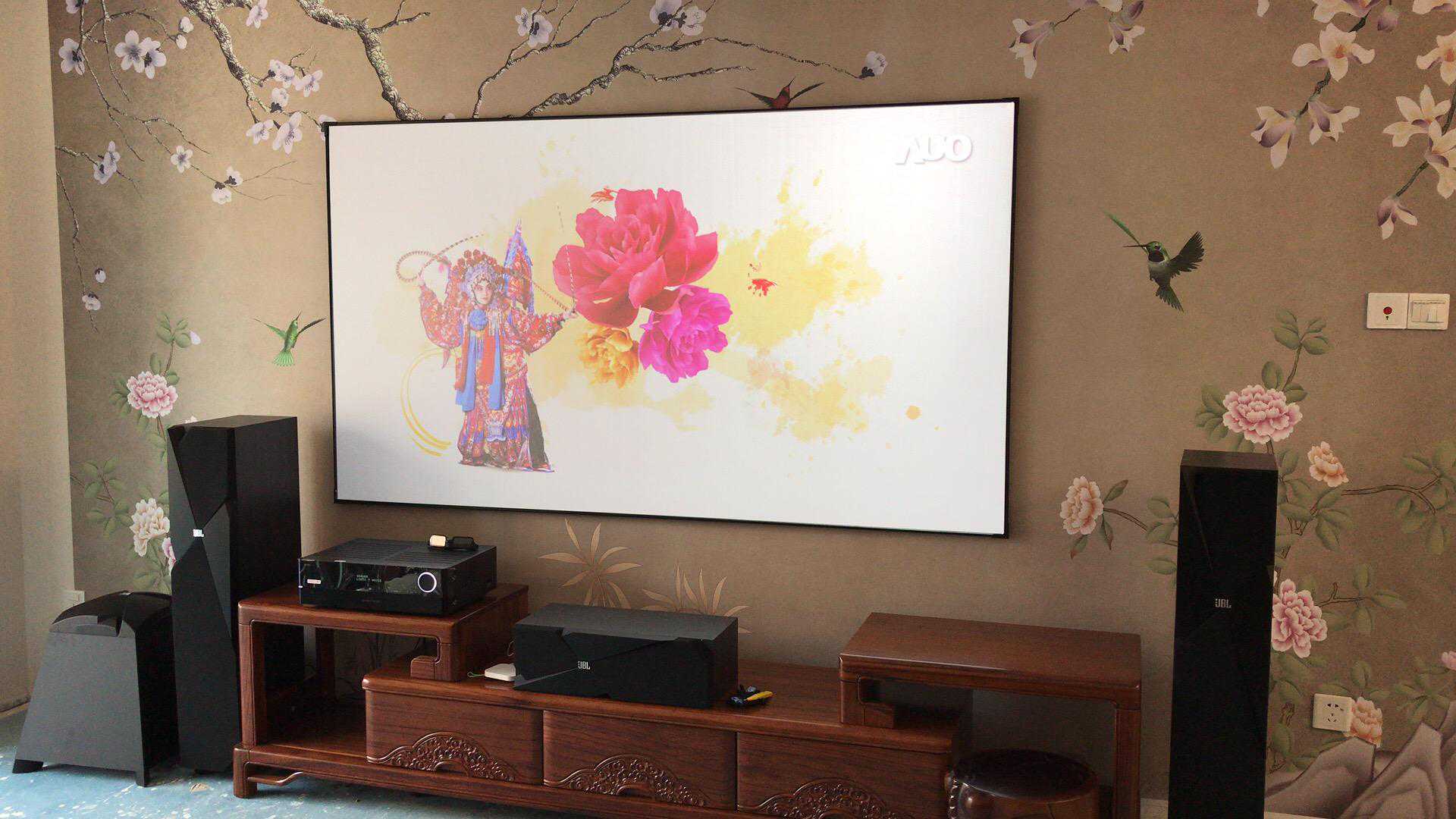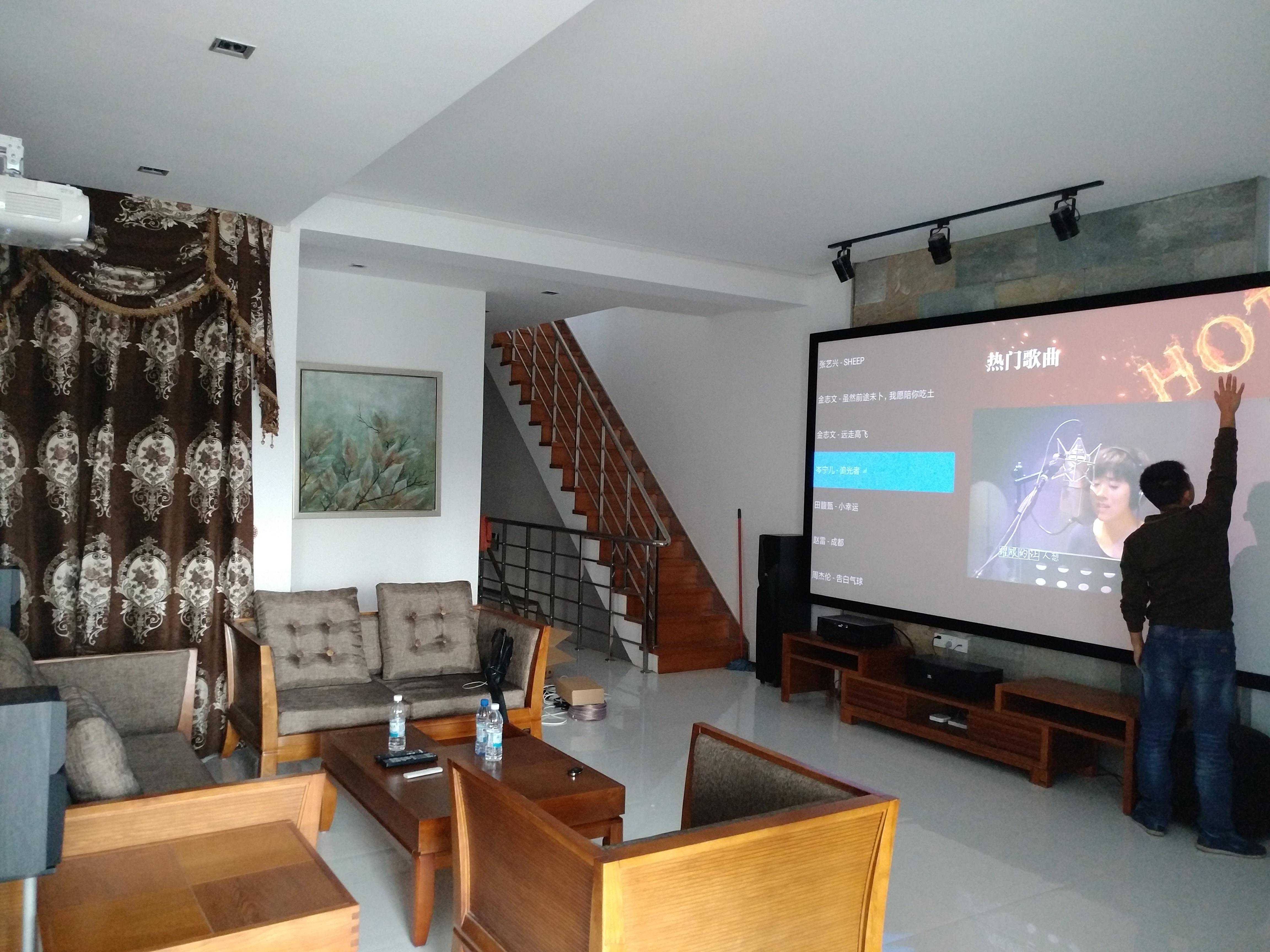 案例一:4年前安装的一套,客户是位70多岁的大姨,没有精力去装修,直接买的别墅样板间,所以贴的明线槽来走线,一楼客厅位置比较宽敞,退休在家喜欢追剧,打造的150寸大屏,客厅位置相对比影音室音响效果虽然差很多,但是使用比较方便,使用率也比较高一些。客户最满意的是屏幕大,字也大,看着不累眼,投影的漫反射原理也不伤眼。