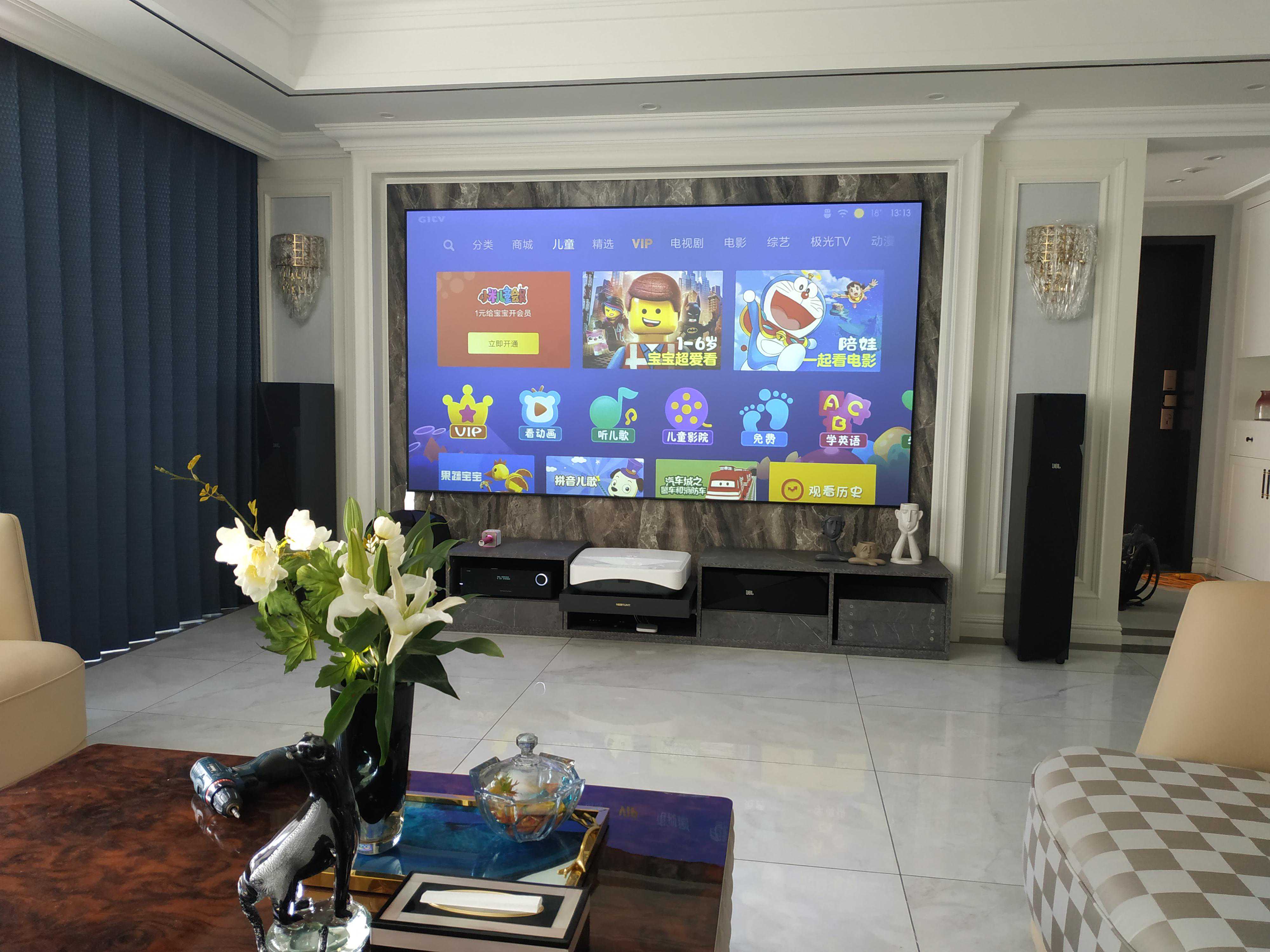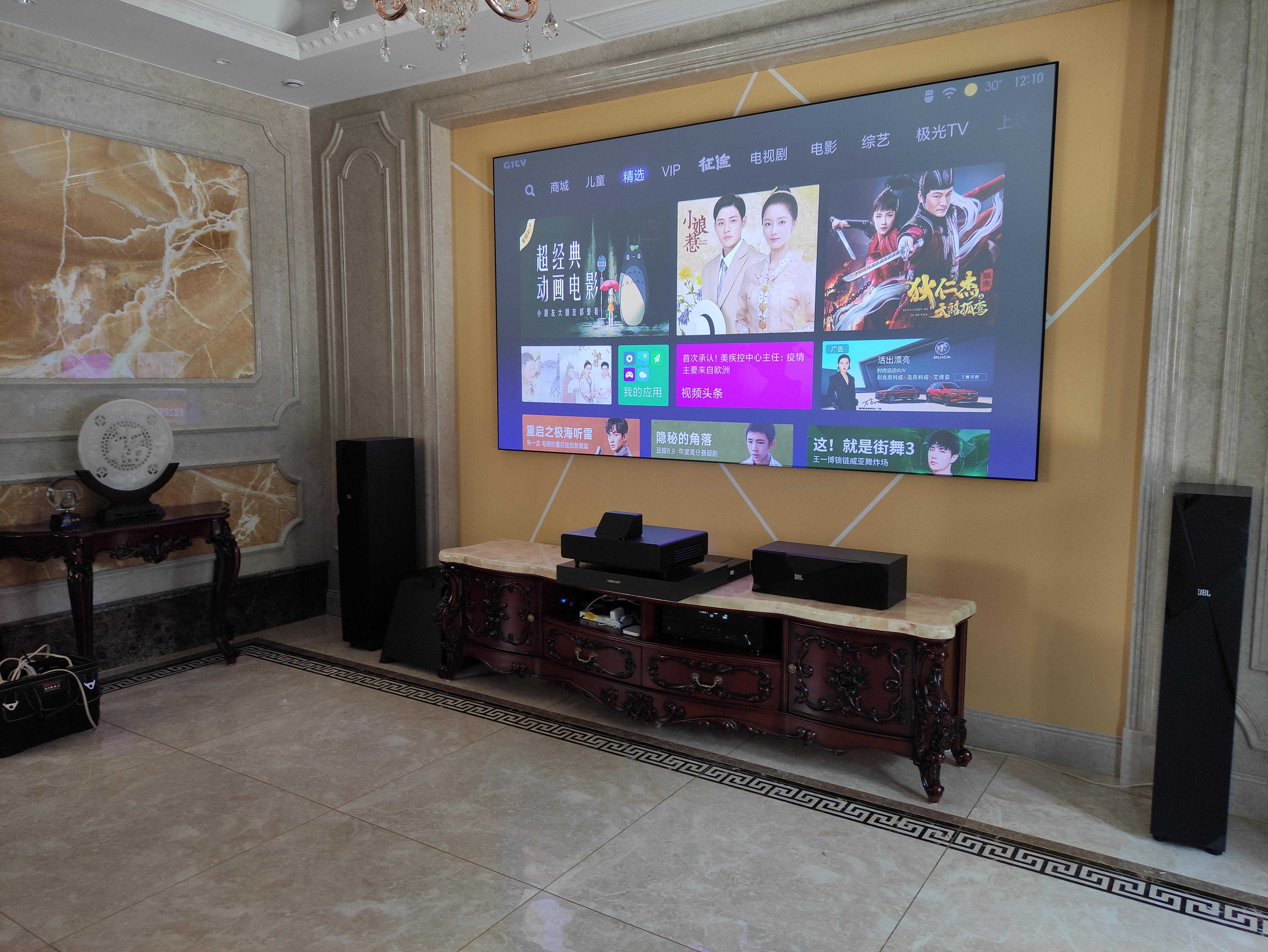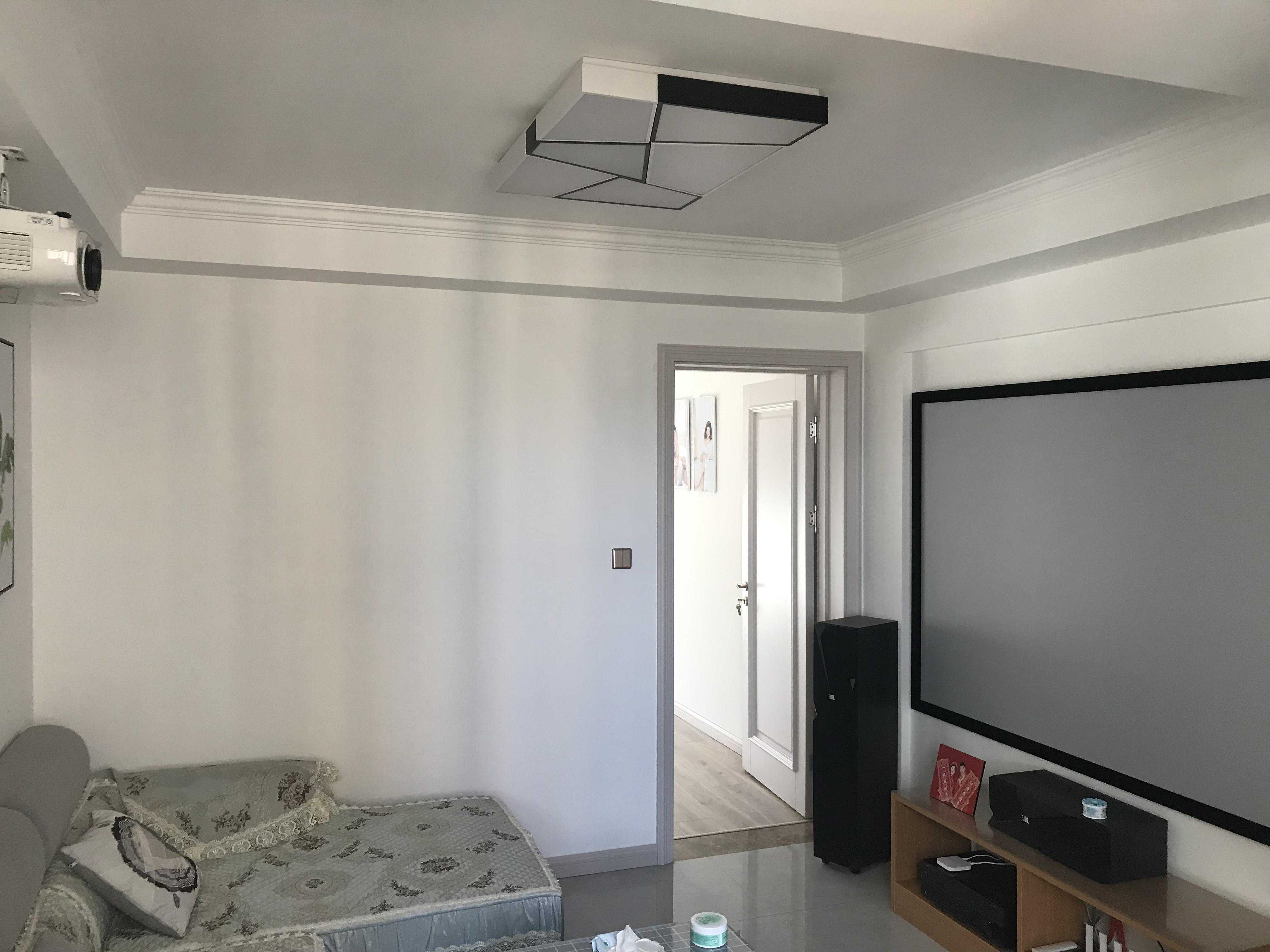 案例八:夏普激光电视+家庭影院,定制的110寸硬屏,电视柜也是设计好定制的,隐藏功放和中置音箱。加了舜合的伸缩台,解决了激光电视投射比不能靠墙的问题。装修整体感觉要求比较高,沙发墙有造型,所以后环绕也采用的JBL吸顶音响来隐藏。