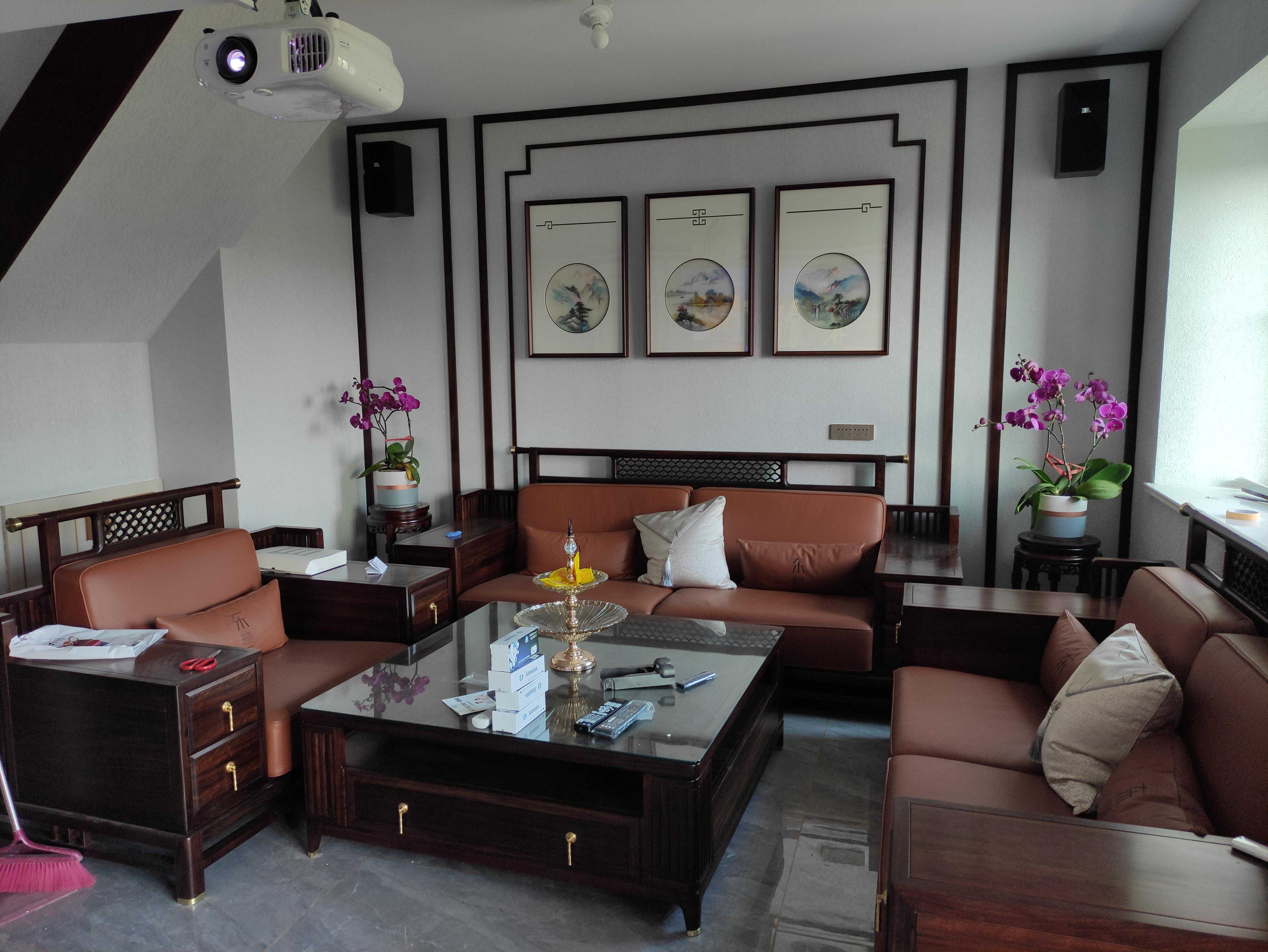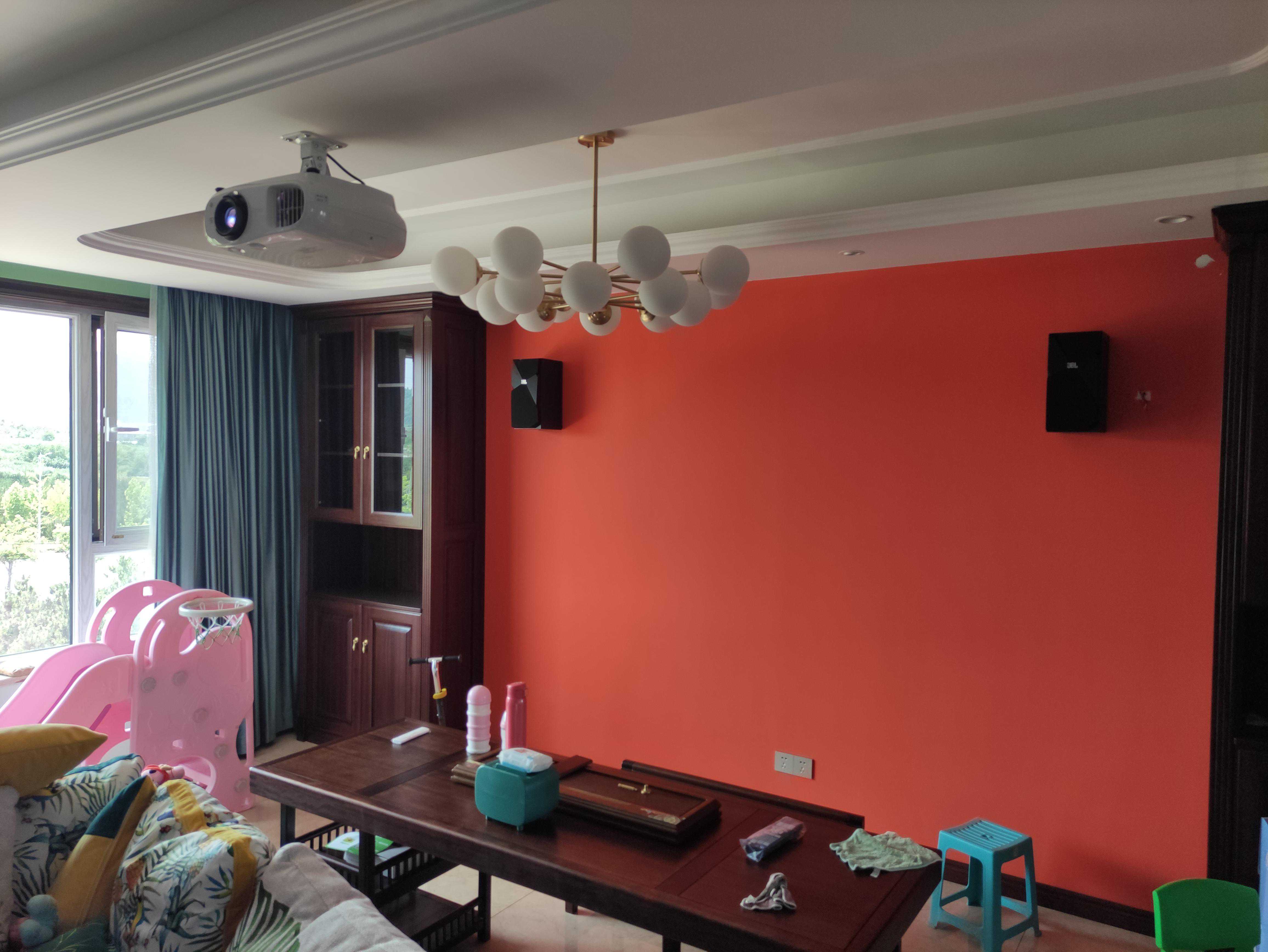 案例五:客厅位置,空间也比较紧凑,中式的风格配上家庭影院也不是太突兀吧?最主要还是实用性以及投影比电视的优势,孩子看动画片再也不用盯着平板、手机去看,也不用总是喊孩子离电视太近了,离远一点看电视了。后环绕音响挂的高点,即为了美观,也是考虑到孩子调皮,放低了容易碰到。