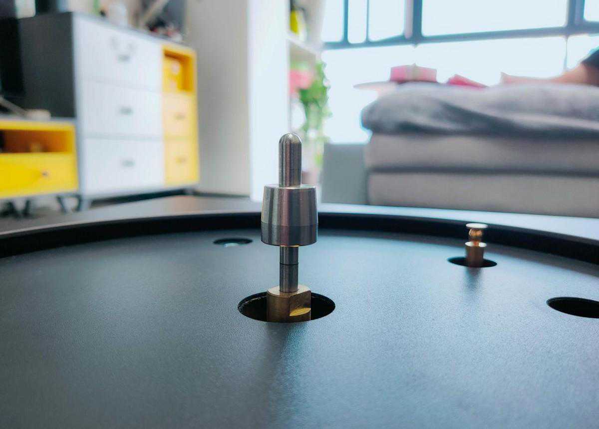 唱片转轴为不锈钢材质,做工上可谓是纹丝合缝,正常放入唱片机中心后由于密封性极好而难以快速安装到位,充分展示了国内机床加工的高超技艺。