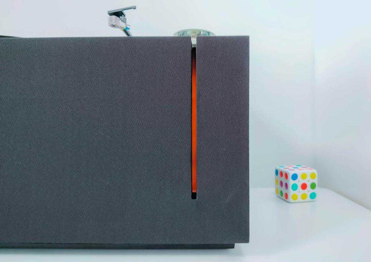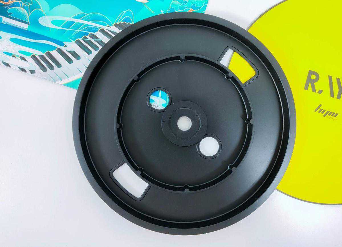 280mm的精密加工金属唱盘,分量十足,同时皮带隐藏在唱盘下方。与唱盘搭配的是同尺寸的唱片垫,两者均为纯黑设计,安装后能与机身和黑胶唱片完美融合。