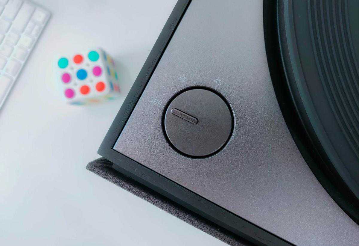 唱盘左下角为唱片机的转速开关,默认为关闭状态,拥有331/3RPM和45RPM两种转速调节,目前市面上主流的黑胶唱片为331/3RPM,取名为“Long-Playing”,也就是我们常说的“LP”。45RPM通常用于灌录流行歌曲,唱片制造商给45转唱片定义为ExtedPlaying,缩写为“EP”。