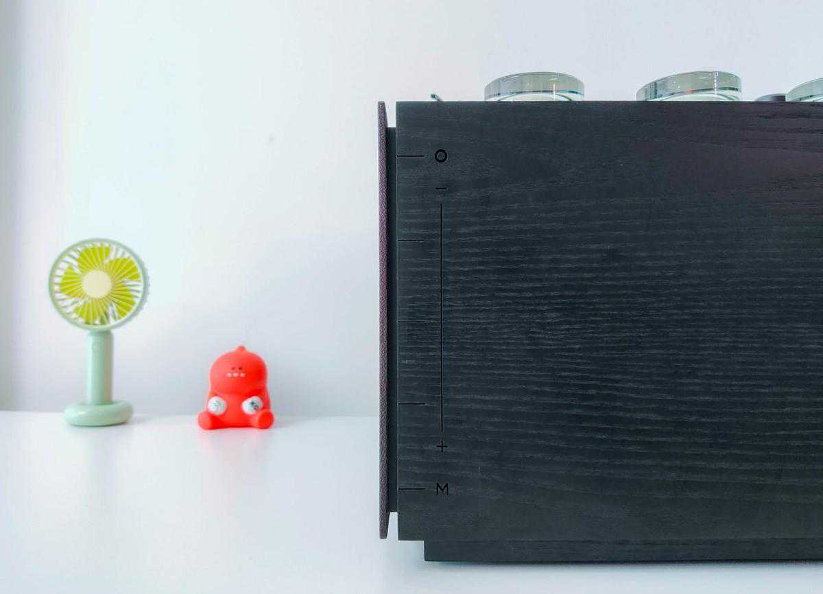 机身正面的灯槽侧边对应的是机身的一系列触控按键,从上往下分别是电源键、音量加减和模式切换按键,从设计细节能够感受到HYM-RAYS黑胶电子管音响在尽可能的规避物理按键,让产品的一体化更强。