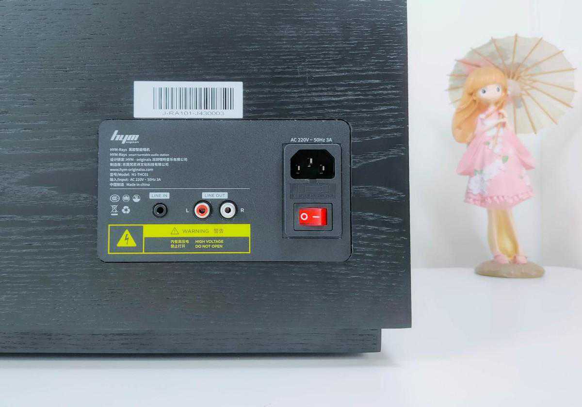 电源接口和一系列的输入输出接口均布局在机身背面,三相电源下方是一颗3A保险丝和红色跷跷板物理电源开关,左边还有一个音频输入接口和RCA输出接口。只需要插一根电源线,就可以享受高质量黑胶音乐。