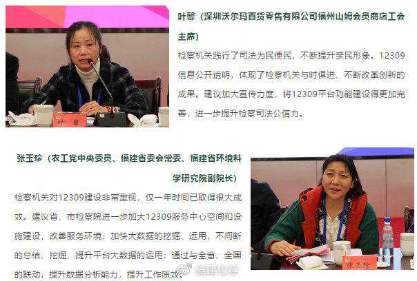 全国人大代表、福建省投资开发集团有限责任公司党委书记、董事长严正说:“我是第一次走进检察院,今天参观了省、市两级检察院的12309,让我耳目一新。”他说,检察机关12309建设有“三个合一”,省、市、县合一;网络、平台、实体合一;检察服务、检务公开、检察监督合一。他建议检察机关认真做好数字检察这篇大文章,把形式和内容统一起来,认真总结经验教训,打造检察精品,让福建检察工作经验走向全国。