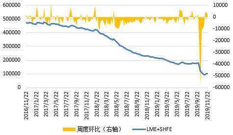 截止2019年11月22日,国内港口镍矿库存总量为1379.0万吨,月度环比增长4.08%;其中高、中镍矿总量为988.0万吨,月度环比增长8.33%;低镍矿391.0万吨,月度环比增长0.77%。