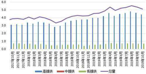10月,国内镍生铁产量(金属量)为5.13万吨,环比下降4.11%。其中高镍铁产量4.42万吨,环比下降4.95%;低镍铁0.71万吨,环比增长1.43%。