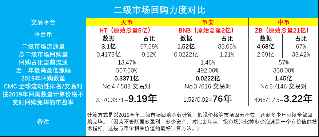 统计数据显示,火币原始发行总量5亿,现总量剩余为4.58亿,销毁0.42亿,现总量占比91.60%;币安原始发行总量为2亿,销毁0.17亿,现总量剩余为1.83亿,现总量占比为91.5%;中币原始发行总量为21亿,现总量剩余为7亿,销毁14亿,现总量占比33.33%。