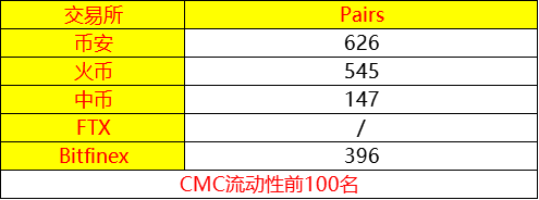 具体来说,根据CMC流动性前100名数据对比,截至2月25日12时,交易对数量方面,币安为626个,火币为545个,Bitfinex为396个,ZB为147个。