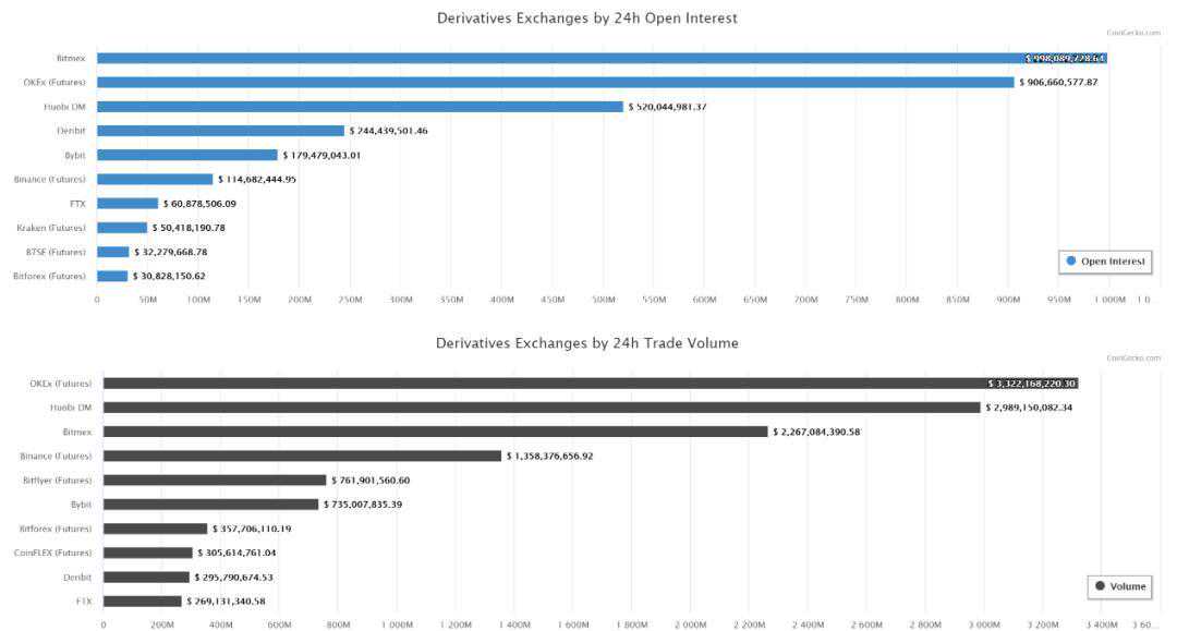 根据2月12月CoinGekco的截面静态数据,OKEx、Huobi、Binance是24小时未平仓头寸累计总额最高的3家交易所。