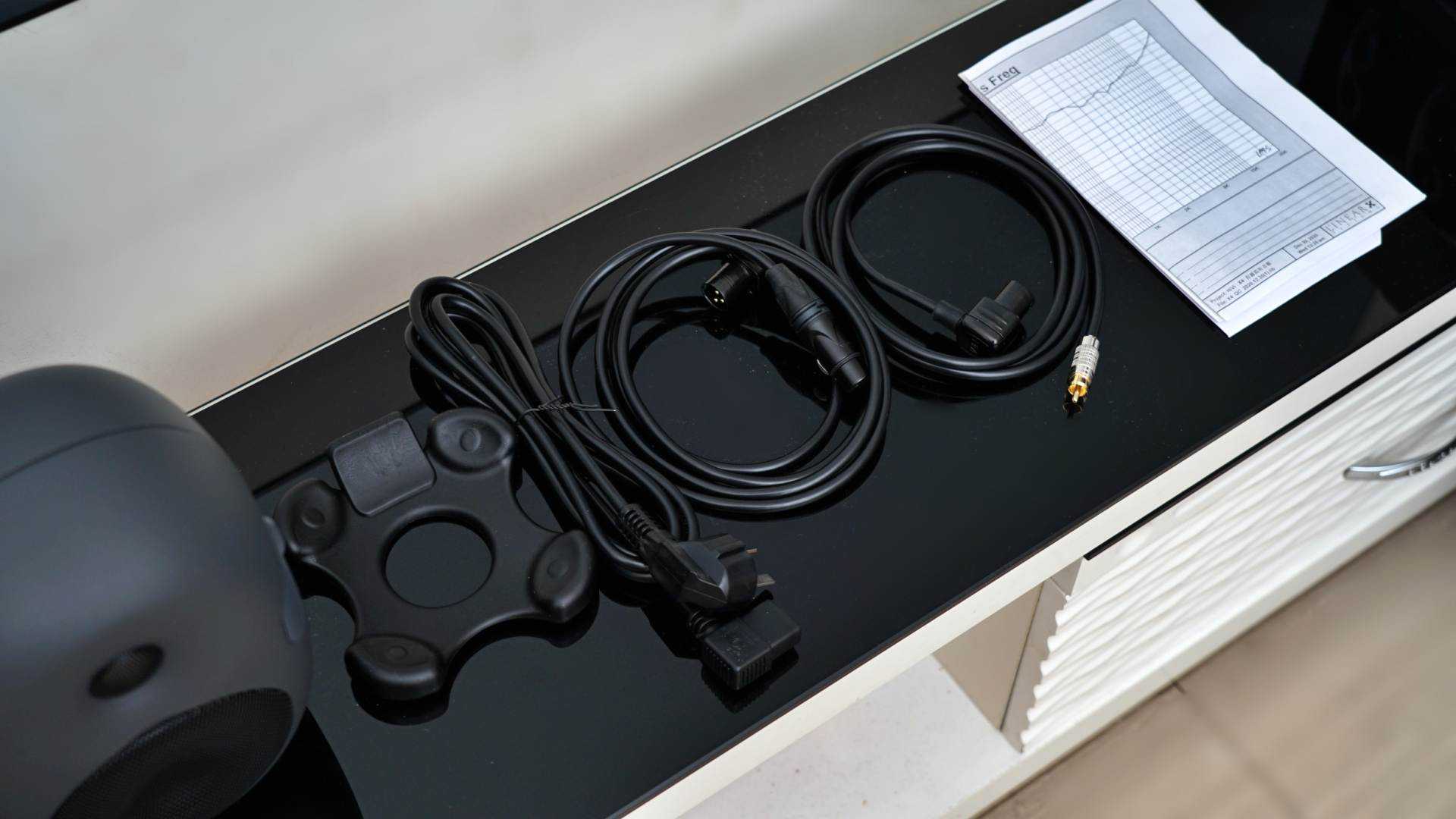 音箱的接口比较少,也不支持无线蓝牙连接,所以配件也比较简单,除了音箱,就是橡胶底座、电源线、XLR音频线、RCA音频线,数据线各两条。