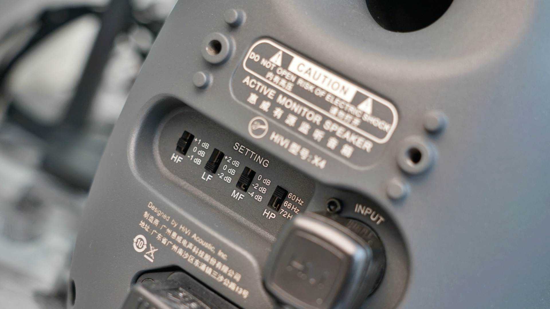 机身背面除了电源插孔、XLR音频接口,低反射弧设计的低音导向孔,就是四个音频增益调节钮,其支持三段频率微调,其中低频200Hz(+2、0、-2dB),中频500Hz(0、-2、-4dB),高频10kHz(+1、0、-1dB),采用有源电子分频,并带频率截至开关。