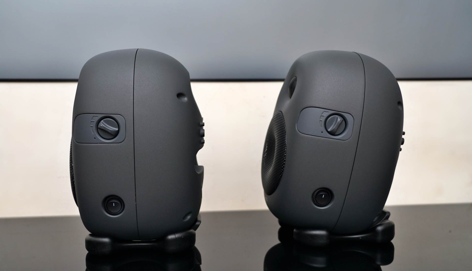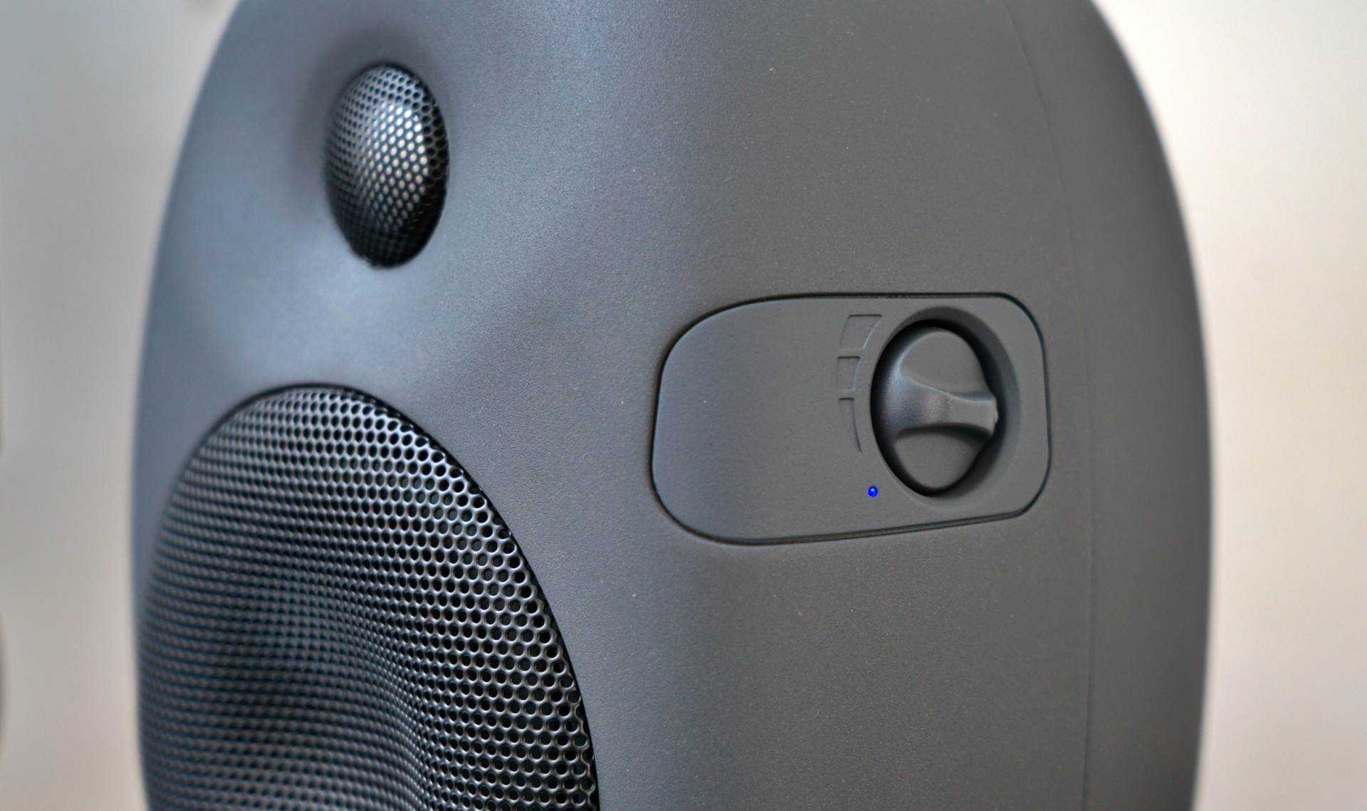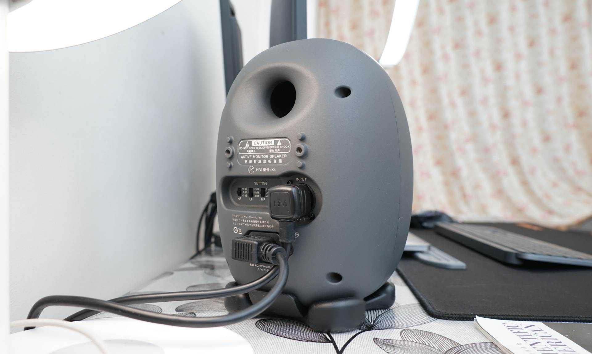 机身右侧是电源开关与音量开关。附送的橡胶底座本来我第一眼感觉不是很起眼,毕竟黑不溜秋还容易沾灰,但实际使用效果很好,独特的弧度设计以及高阻尼的特性让惠威X4放在上面可以实现约10度俯仰角的调节,这非常有利于后期桌面摆放时,让高音直达耳朵。