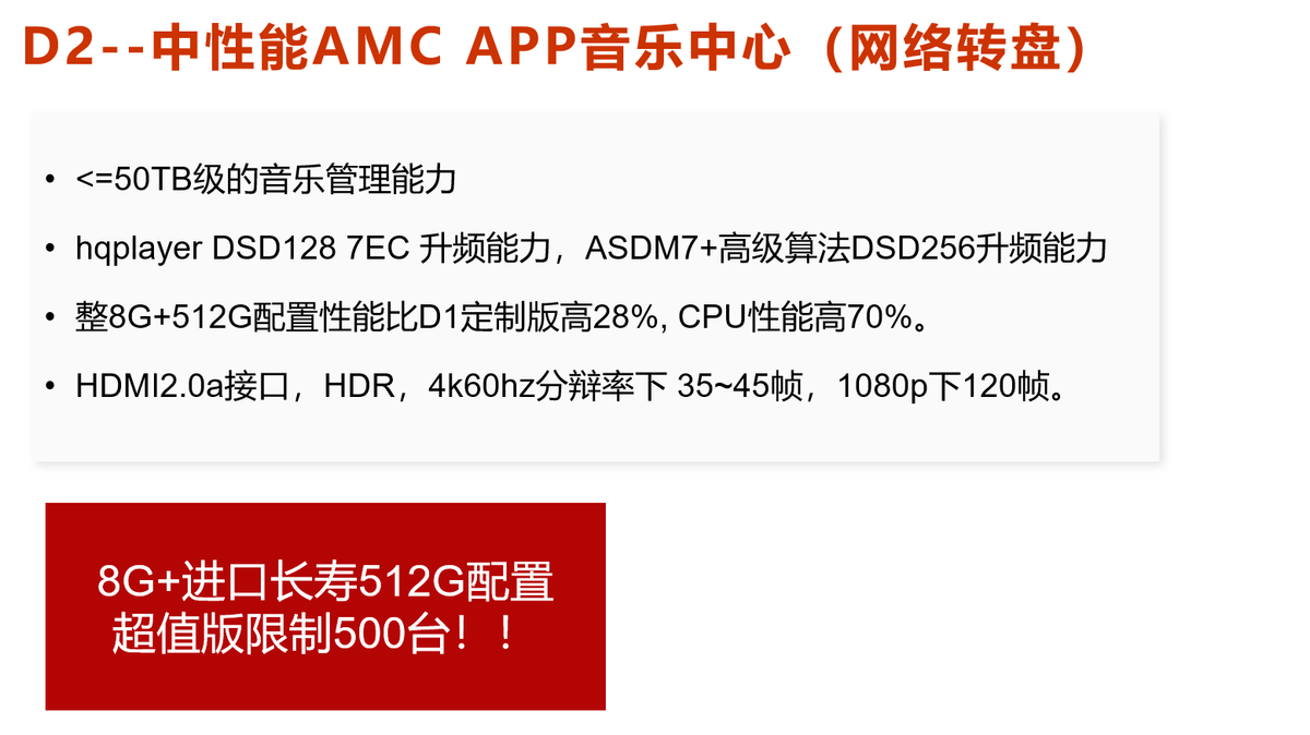 D2是一个定位于几十TB级大容量音乐的内容管理平台,也是中档音乐升频性能音乐主机,全格式DSD256采用ASDM7优秀超采样算法,DSD1287EC采用较优秀超采样算法。采用豪华定制全屏蔽,全灌封200W级的超低噪声大电流线性电源供电,普通音乐播放状态近10倍额定余量,近100倍的瞬态余量。配置为10nm桌面级低功耗4核CPU、进口512GSSD、8G板载内存。定制低噪声宽温工业主板,深度合作开发BIOS优化,定制突破原CPUTDP限制的电源与BIOS,采用定频运行方式满足高响应低延时的需要。采用享声独家豪华线性化再生噪声去除方案与PA1相同,但是两个通道均可独立使用,无论USB电源还是信号均达到苛刻的超低噪声HIFI要求。另外,双重再生的网络输出专为网络解码器提供参考级的纯净信号输出。值得一提的是,D2将采用专用于音频播放的高度精简AMCwindowsAPP网播系统,支持选购定制触屏。