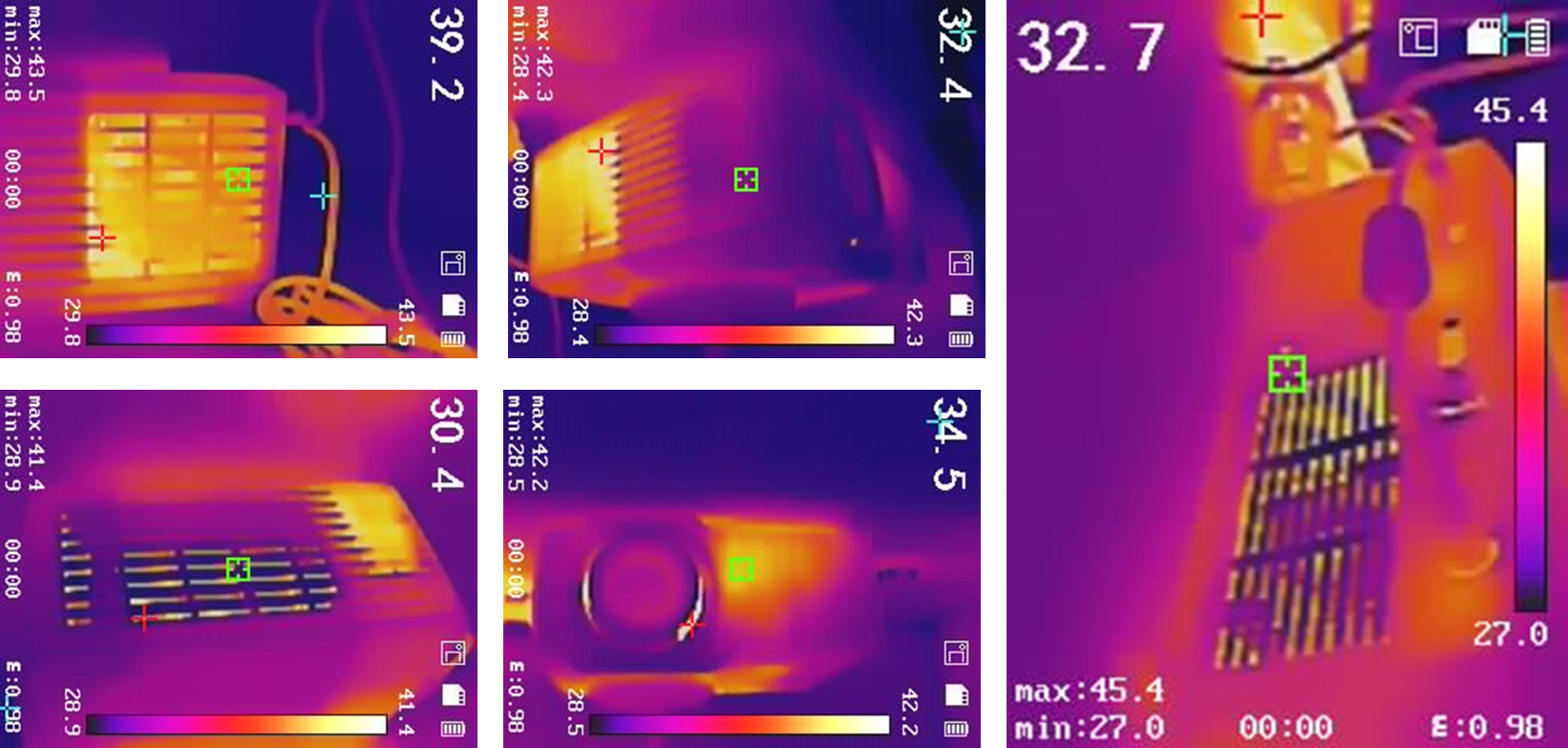 简单看看温度,运行一段时间后,室温25,散热温度最高的地方45.4度,出风口温度并不高,所以散热可控,算是一个温度较低的投影仪了。