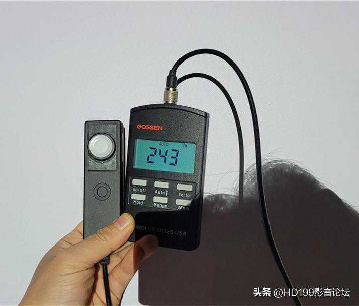 我用德国高森GossenMAVOLUX5032B照度计,放在幕布上直接对着投影镜头测量最大光输出能力,摆脱了幕布增益的干扰问题,测量结果应该是比较真实可信的。