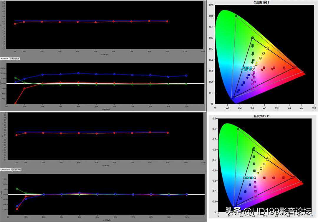 我用点测光的topconBm5来测量黑位和开关对比度。为什么我用bm5而不是很多人用的爱色丽或者红蜘蛛色度仪来直接测量黑位和对比度呢?原因是黑位的亮度很低,一般消费级的色度仪没有足够的灵敏度去准确计量它的数值,会出现较大误差。大家知道对比度是最大亮度/最小亮度的比值,最小亮度对于xw5000这类反射液晶面板具有优秀控光能力的投影,只有0.001nit的数量级,那么误差一点就会导致最后计算出现差之毫厘,谬以千里的结果。所以我们测量黑位,必须采用业界产线和实验室专用级别的高灵敏度测量仪器,才具有合格的弱光分辨能力。有些朋友可能会问,那我用爱色丽和红蜘蛛也能读出黑位数值啊,为什么会不准?这里面通常有个采样问题,那就是低端消费级的色度仪,他为了读到弱光数据,会延长采样时间,专业术语叫增加采样的积分时间,这就类似我们拍照的时候光不够,我们就用比较低速的快门,来延长曝光时间来获得合适的曝光。但这样做是不得已为之,传感器的背景噪声会不断累积,杂散环境光或者其他干扰也会被采集进来。