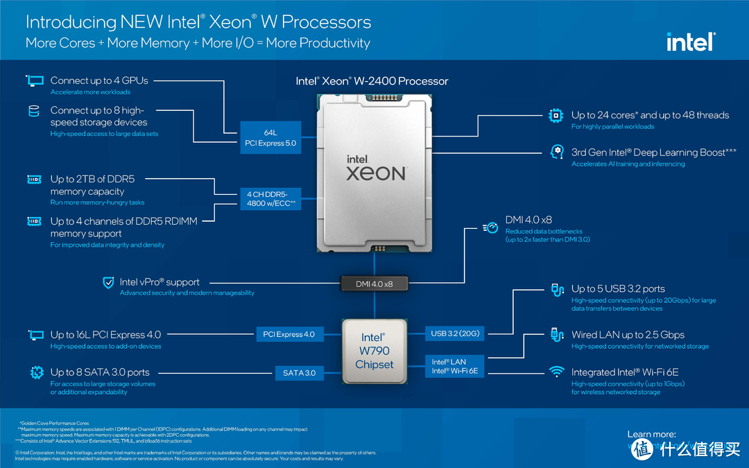 对于W790芯片组而言,简单看一眼BlockDiagram就能看出这是专为Workstation而设计的,标准的HEDT定位