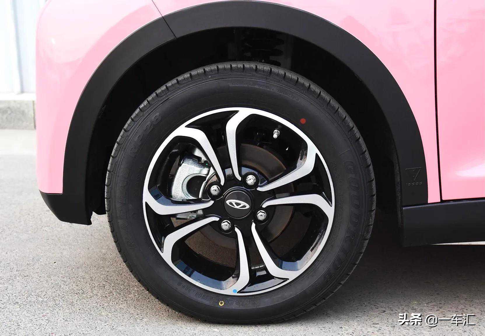 车身长宽高分别为3200/1670/1590mm,轴距2150mm,最小离地间隙120mm。车型采用的是15英寸铝合金轮毂,银黑双色切面花瓣样式,视觉效果时尚精致,制动类型为前盘后鼓;轮胎匹配朝阳旗下好运牌RADIALRP280系列,规格为165/65R15,车内标配胎压显示系统。