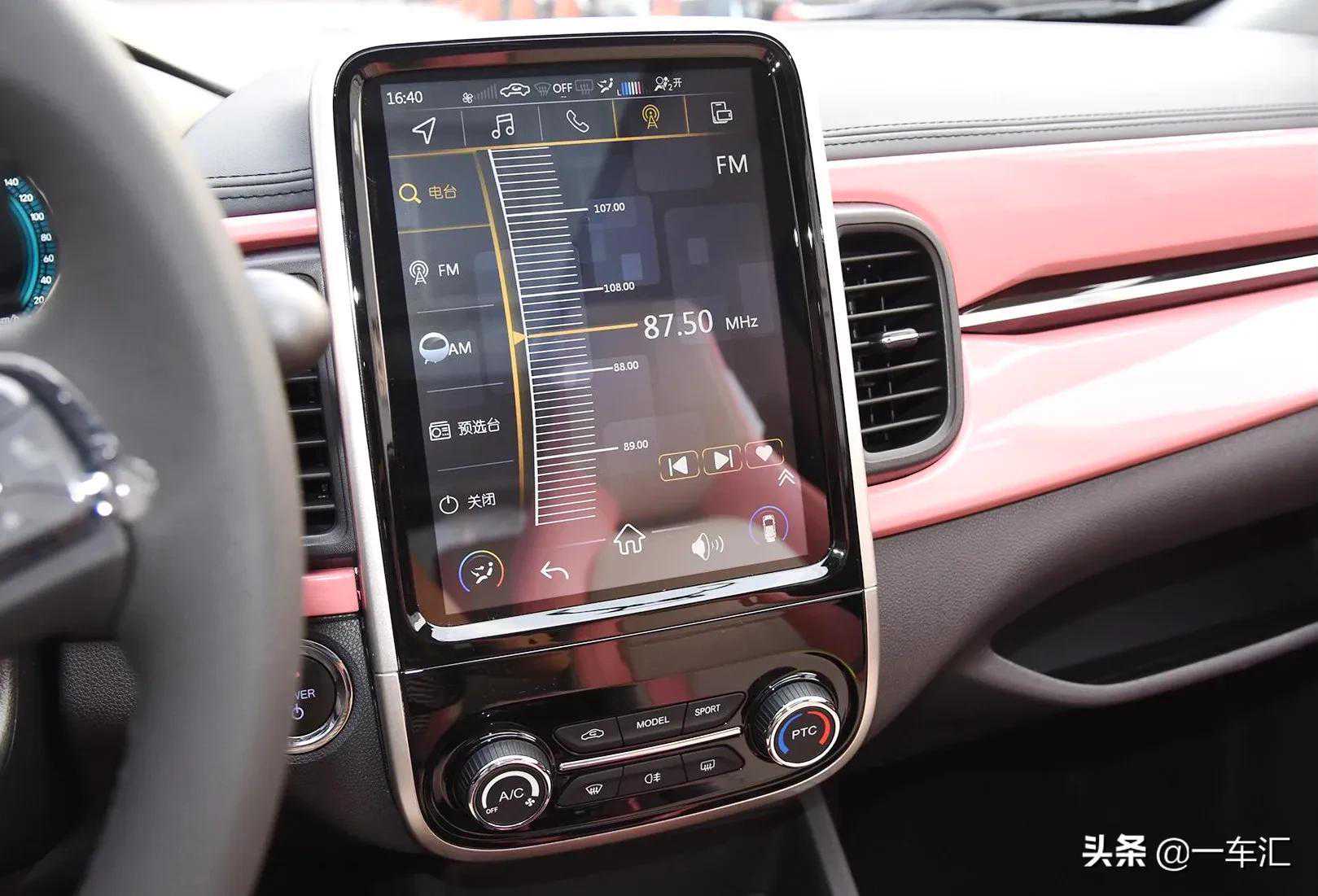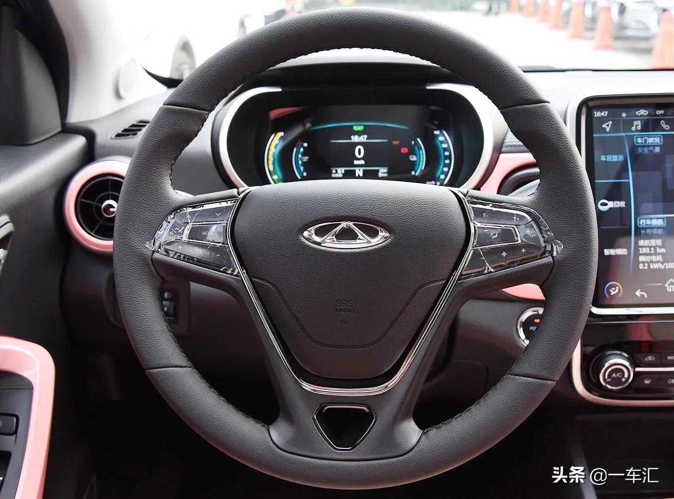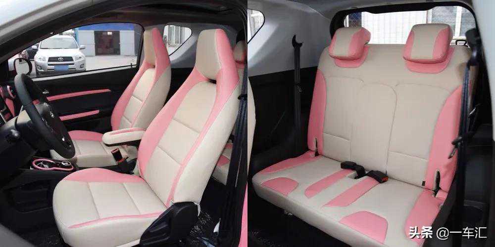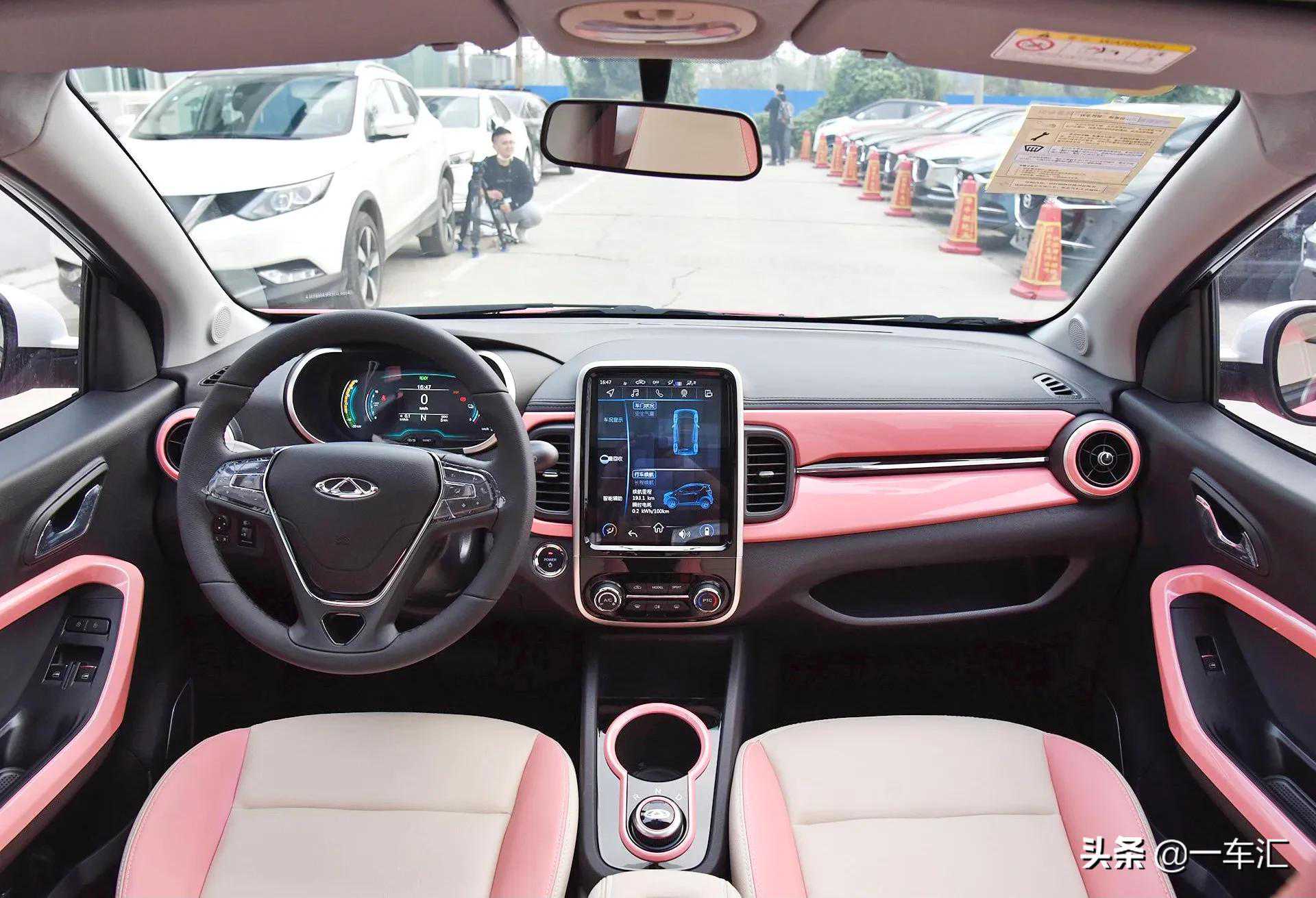 内饰方面,奇瑞eQ1车内同样没有像同级别其它车型那般前卫,整体更接近传统燃油车布局。中控台表面和车门等其它部位,加入了和车身一致的粉色烤漆装饰,由内到外散发着浓厚的年轻气息。中控台上方采用了大面积搪塑材质覆盖,边缘辅以缝线工艺点缀,搭配细节处的黑色烤漆与银色边框,整体质感还算不错。