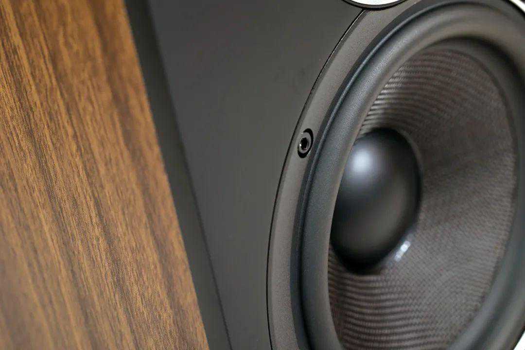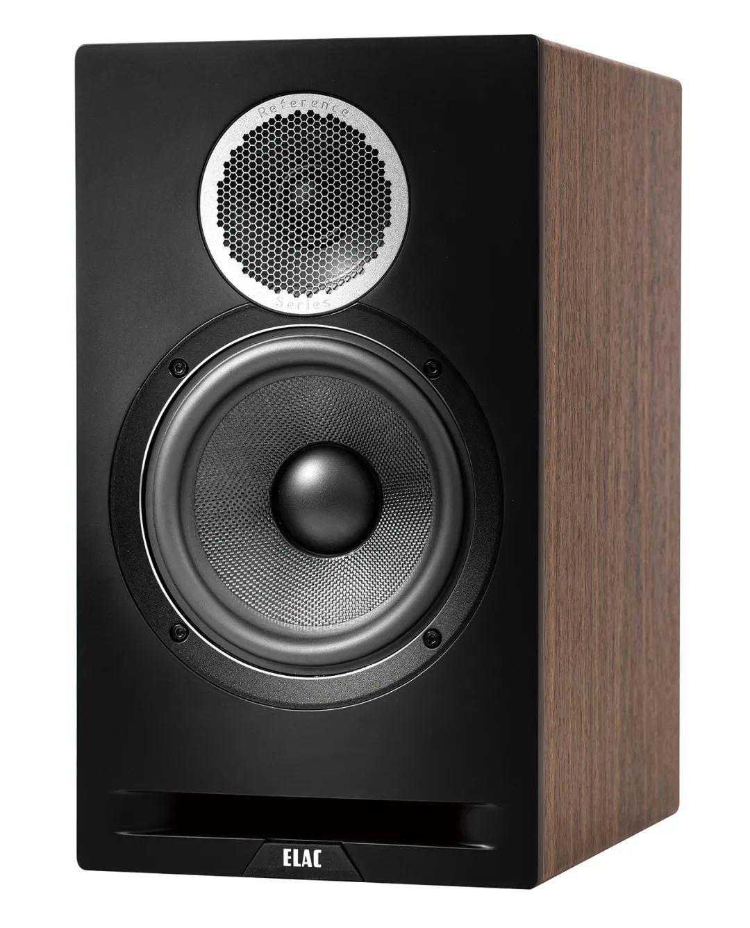 ELACDBR62外观设计令人喜欢,从我个人的审美角度来说,音箱的外观设计也是体现厂家实力的一种表现,哪怕是入门级的产品,DBR62虽然还是长方形箱体设计,第一眼看到就觉得外观设计有亮点,金属高音面板外圈刻有“ReferenceSeries”字样表示这是参考系列,虽为ELAC的入门箱,声音素质上并不“入门”。Elac新研发的浅号角设计波导高音面板,改善了高音指向性和箱体障板对高频的衍射效应,这只高音单元使用1英寸丝膜软高音,高音延伸上限为35Khz,而低音单元为6.5英寸的芳纶纤维盆,振膜的刚性和阻尼都比较理想,这枚低音采用全新设计的压铸盆架,能有效提升单元的散热性能和抑振能力。高强度的塑化前障板,也在一定程度上降低了箱体共振。与倒相孔一体成型的高强度塑料前障板底端横卧一条狭长的“导相孔”,跟传统圆形导相孔设计不同之处是声学设计上的原因,而不单纯是为了好看,比如降低导孔气流噪声,提升低音表现的同时还做到更美观,不是一举两得么?箱体也不用做得像有些传统前导相书架箱那么狭长,宽高更接近黄金比例,外观更加的协调,而且导相孔设计在前端,用户们也能更加灵活的摆位。对了,差点忘了这箱子亮点之一的磁吸网罩,网罩的磁吸结构设计使用户可以快速拆卸,摘下网罩的时候,音箱前障板由于没有卡孔扣非常干净;而用网罩的时候,银灰色麻面编织布网罩与黑灰色的前面板、胡桃木色贴皮侧板顶板组合起来相得益彰,上了网罩后音箱前面板仅露出上、左右窄边和底部横卧的狭长导相孔以及梯形立体切割装饰ELAC的logo,是一种极简之美,镀金接线柱的质量看起来很不错。