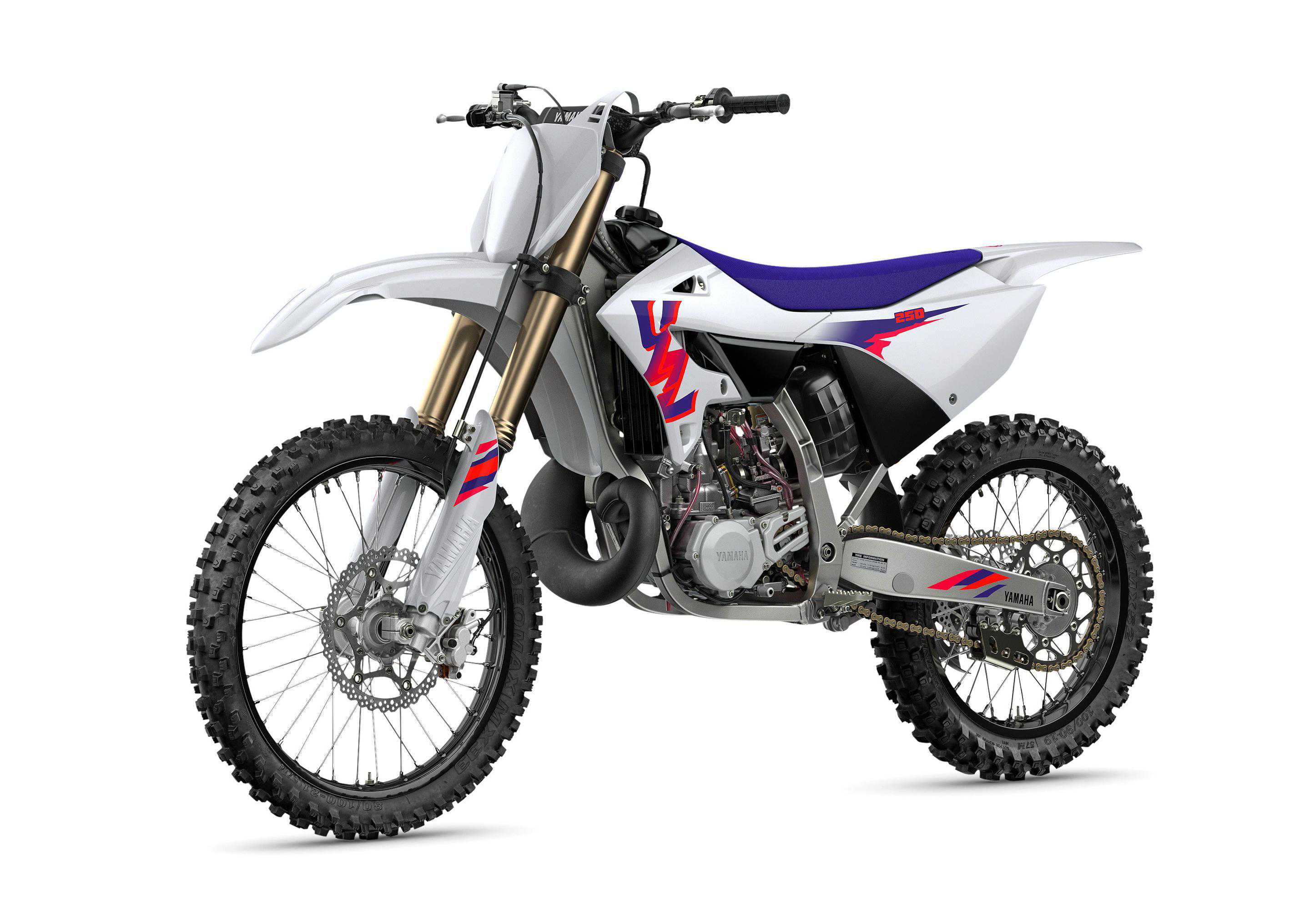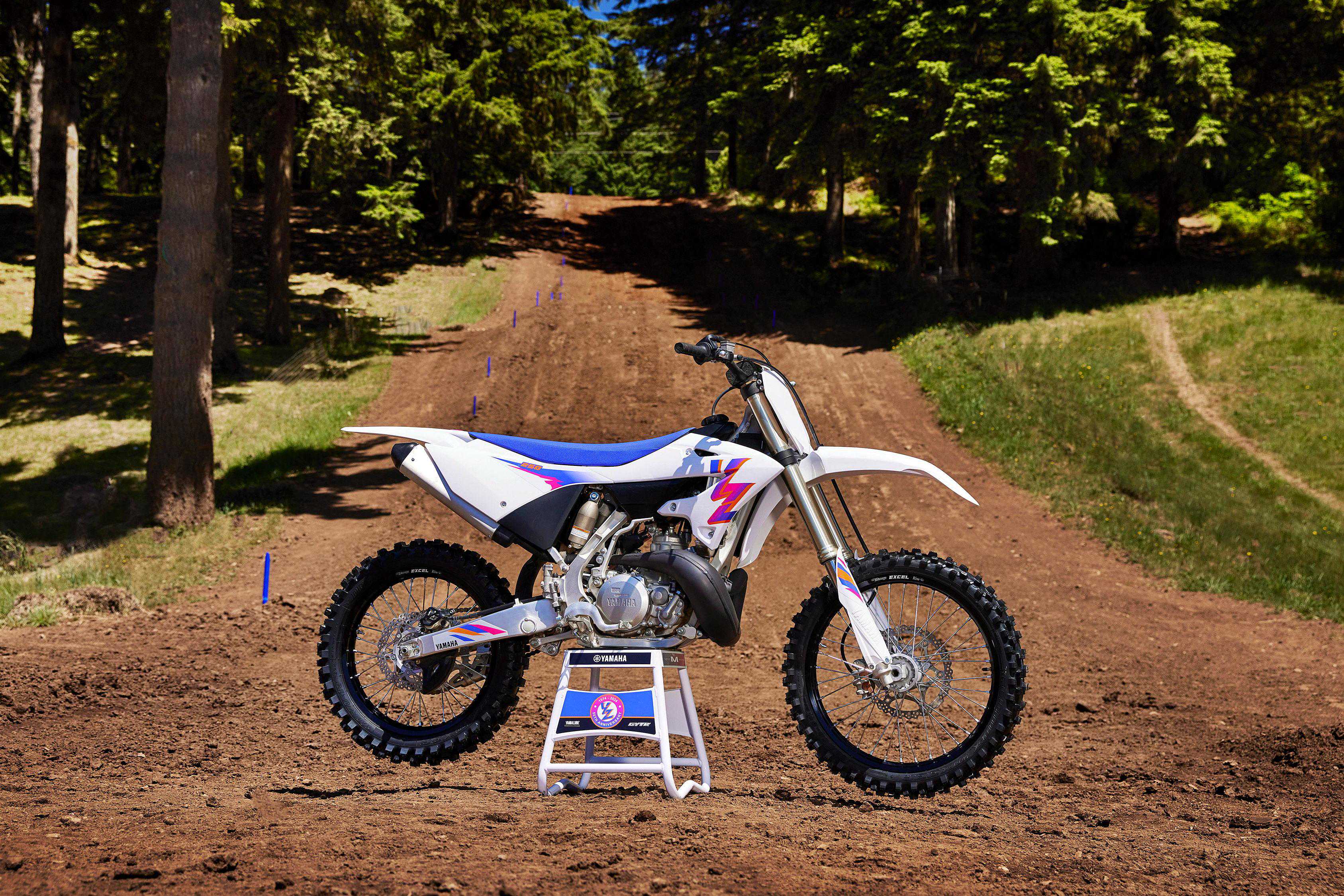 2024YZ125LC五十周年纪念版以标准版为基础,车身图案修改为白色的主色调、粉色的线条,这是YZ在上世纪七十年代里的传统色彩风格。此外,紫色的鞍座(标准版使用蓝色的鞍座)、黑色的前后车轮(标准版使用蓝色的前后车轮),也是这一版本的独特之处。