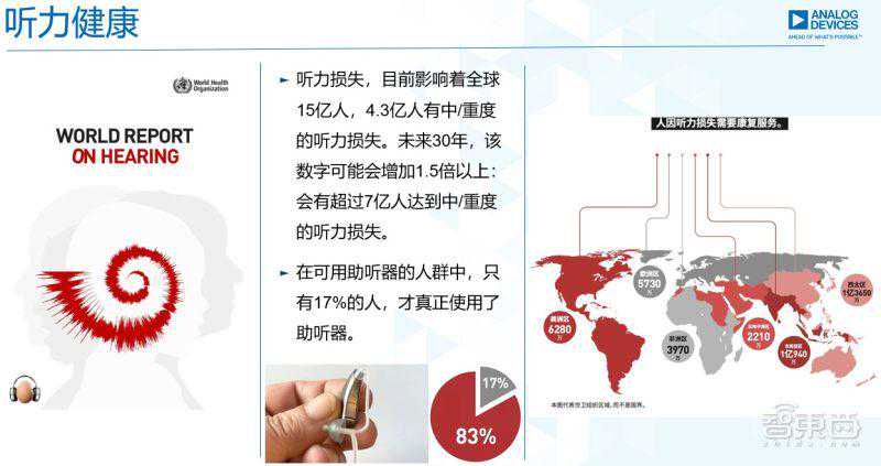根据今年国际卫生组织发布的第一份世界听力报告,全球五分之一的人存在听力受损问题,其中4.3亿人存在中/重度听力损害。到2050年,存在听力受损问题的人数预计将是现在的1.5倍,可能会有25亿人患有听力损失。