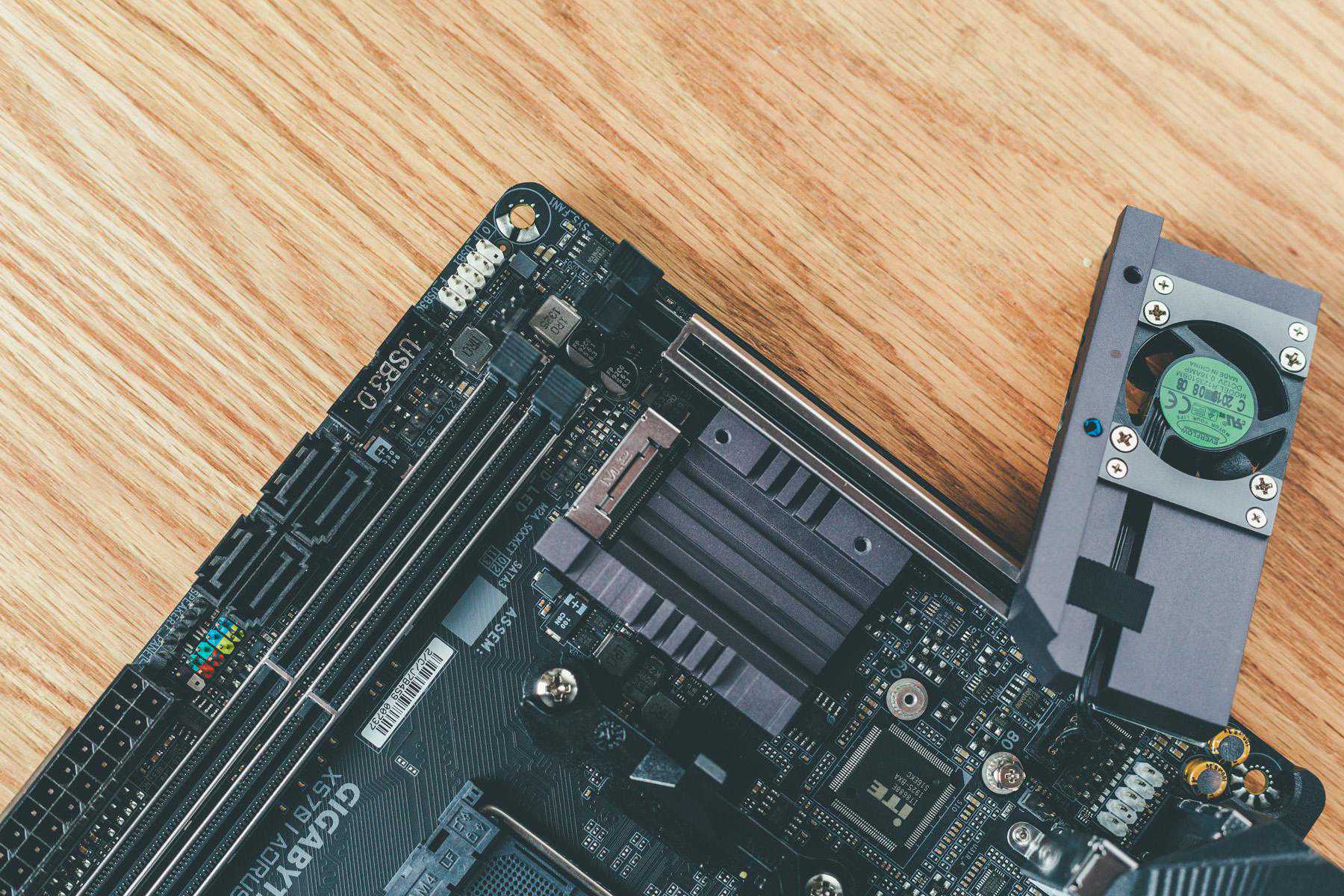 硕大无比的散热模块,也是采用了堆叠散热技术,但是这个散热马甲,直接导致了我原先选定的乔思伯散热器装不上去,最后不得不换利民散热器,所以类似这种自带散热马甲的ITX主板,建议水冷,或者热量不高的CPU,可以考虑超薄下压散热器。