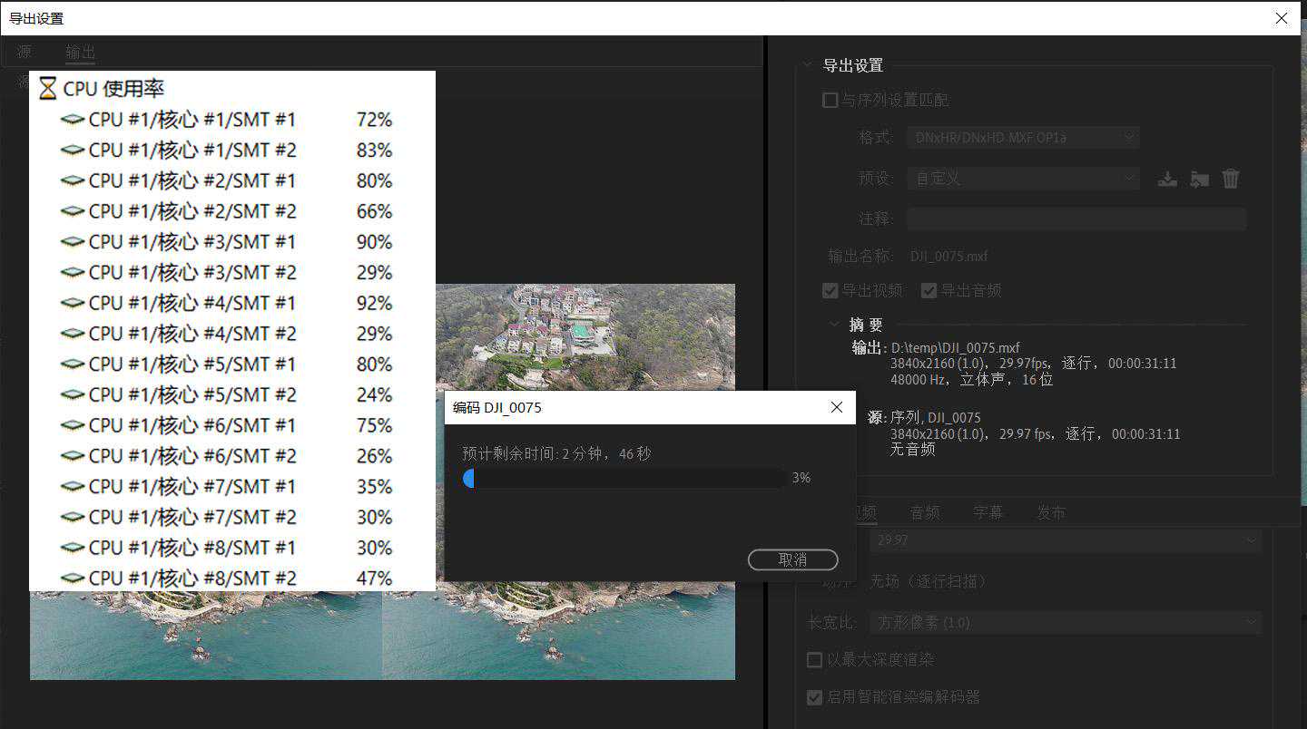 但是进行渲染操作的时候,CPU立马满负荷运行,这也可以理解,毕竟是四个4k素材同时进行渲染,不过这和lightroom一样,虽然峰值是100%,很快就会掉下去,而且依旧可以进行其他常规程序的运行,不会完全卡死。