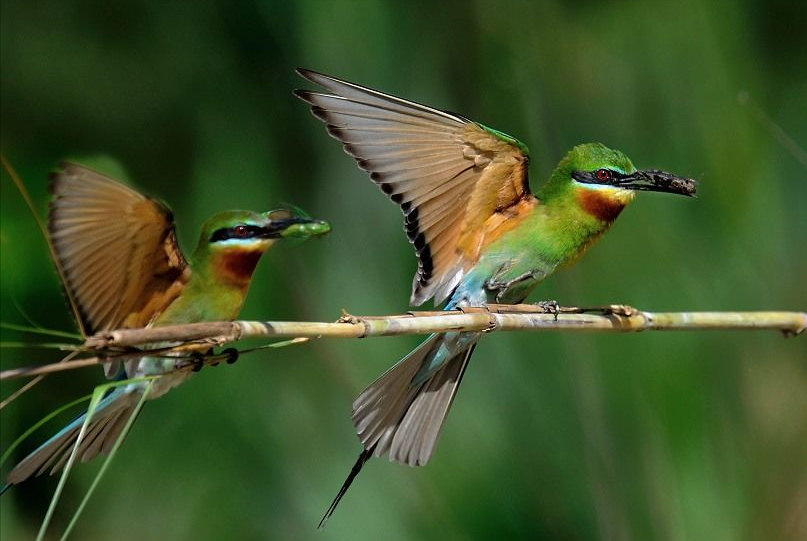 佛法僧目的鸟分布广泛,形态结构多样,各科特化程度高。成员体型大小不一,生活方式多种多样,多数种类以昆虫和小动物为食,有些种类食鱼,还有些种类食果实。佛法僧目有9科,中国有5科:翠鸟科、戴胜科、蜂虎科、佛法僧科、犀鸟科。