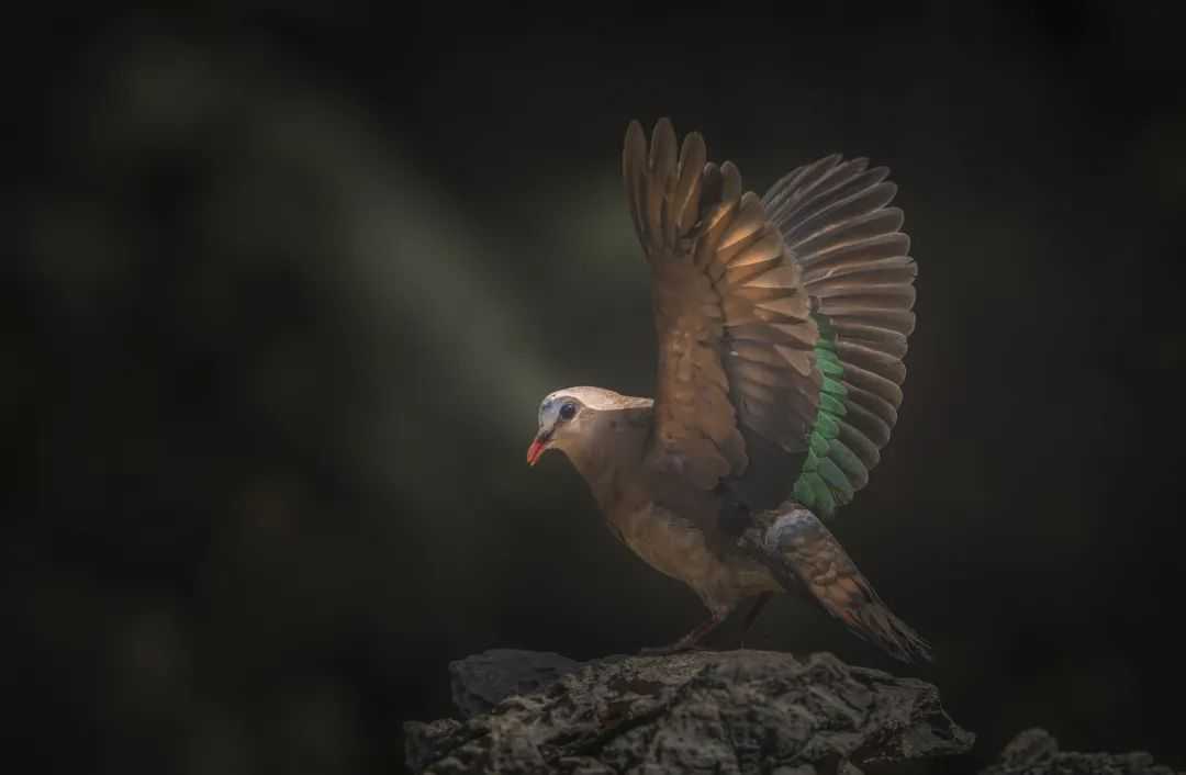 我拍过的一组光影下绿翅金鸠展翅的照片,获赞不少,哈哈