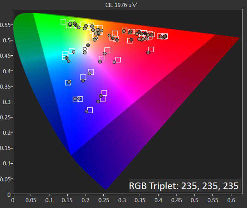 在色彩容积方面的测试,明亮影院(HDR)模式实现了接近100%DCI-P3的色彩容积,148%左右的色彩容积以及67%左右的色彩容积