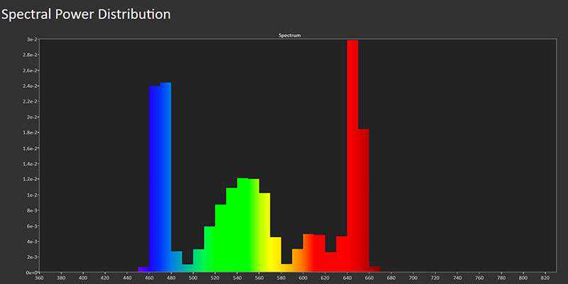从投影机的光谱能量分布测试可以深入地了解其光源系统的特点,为此我们通过PortraitDisplaysCalman专业色彩测量软件与分光计,对VPL-GTZ380进行了深入的光谱能量分布测试。从结果可以看出,蓝色和红色部分的能量较为突出,其中红色部分得更高,而蓝色部分波长在450nm以上,避开了对人眼伤害较大的430nm段。这样的光谱能量分布规则也符合VPL-GTZ380所采用的三种不同激光二极管的光源结构。