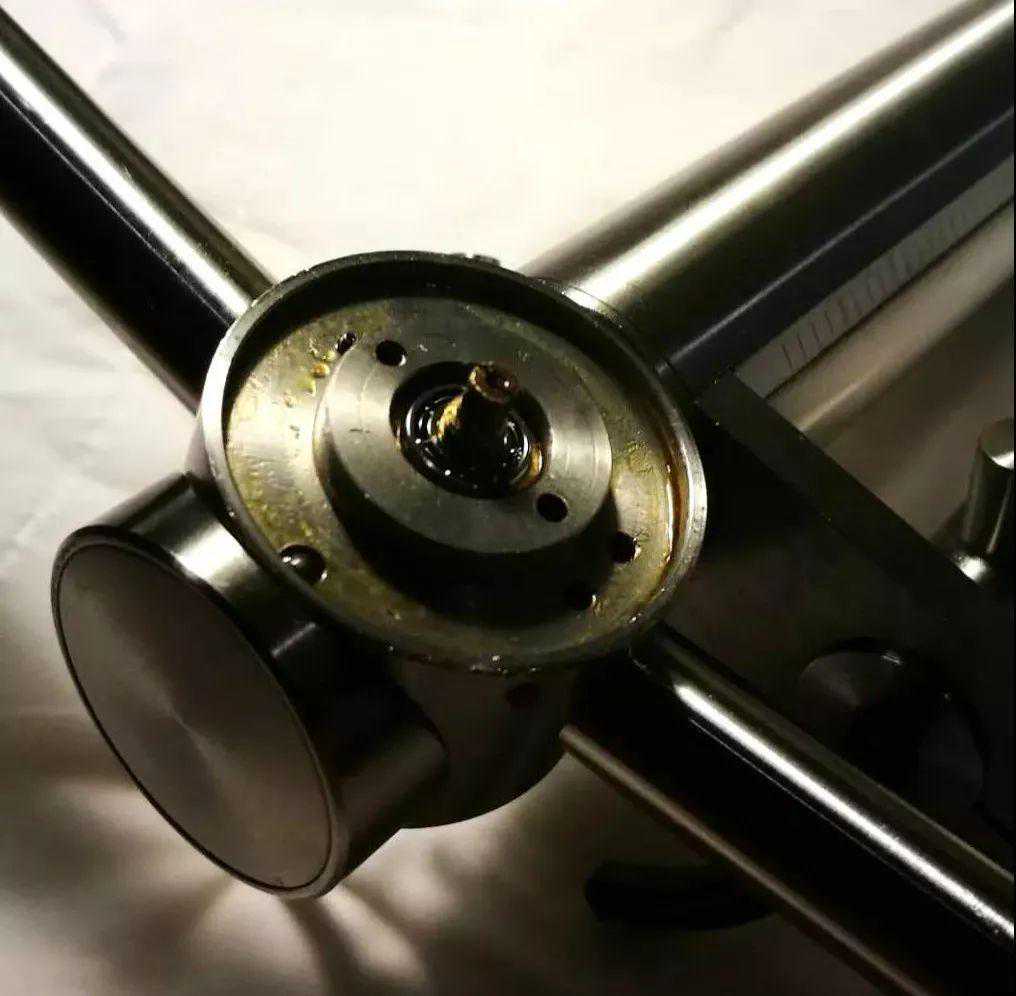 FR64S的针压刻度轮位置在支点轴承上,打开刻度轮可以看到类似发条的结构,用以给唱臂中心轴施加固定拉力,在使用过程中发现FR64的发条结构能长期稳定而且针压及其准确: