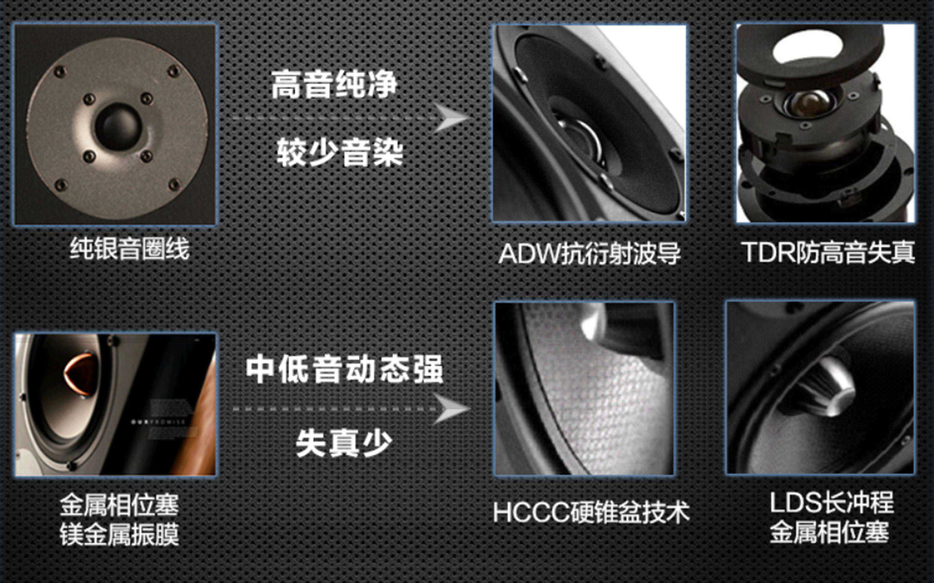 ▲扬声单元采用纯银音圈线和金属相位塞镁金属振膜,主打纯净高音和动态感强、失真少的中低音。