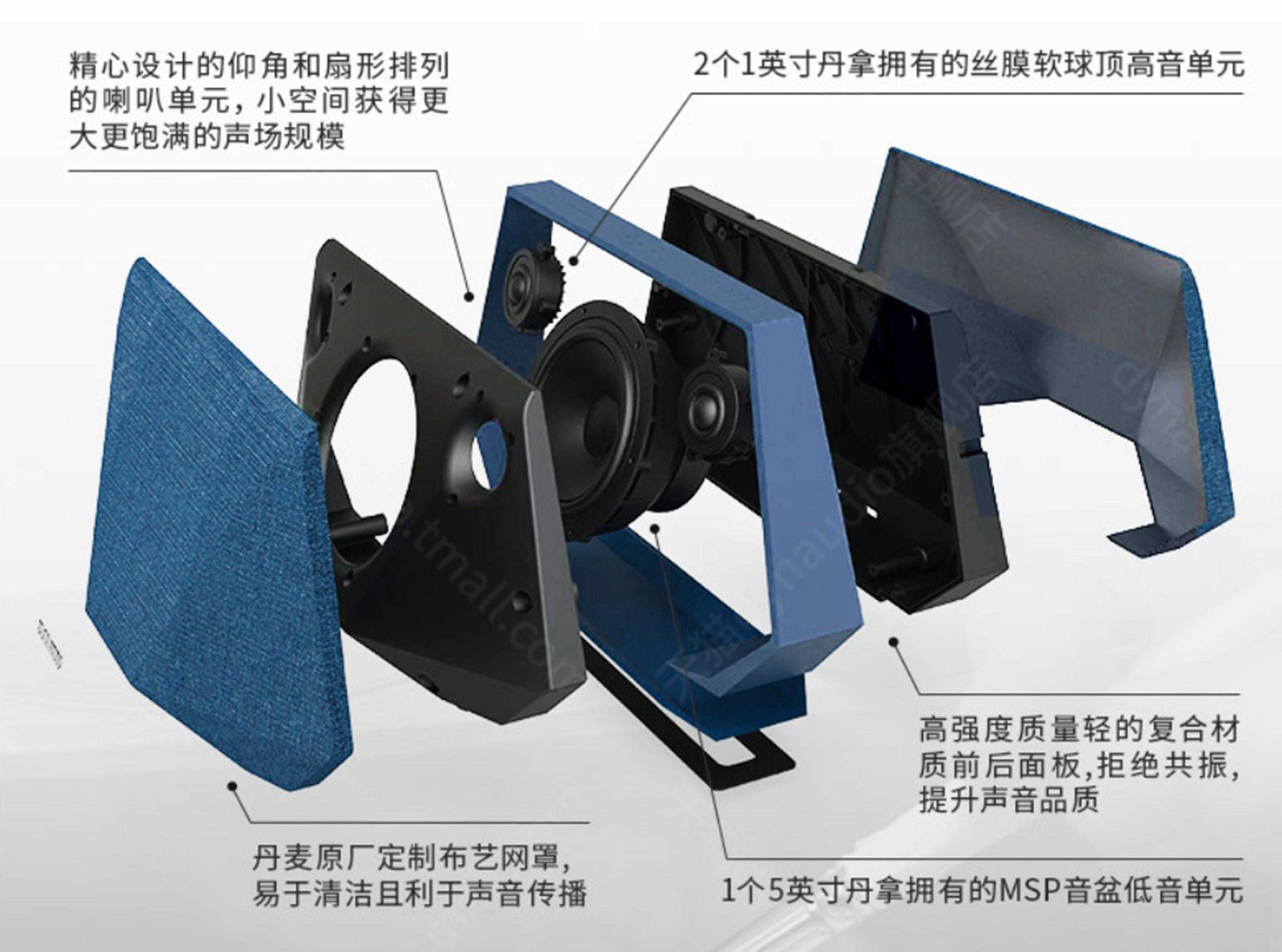 ▲布艺网罩有点类似尊宝S803的风格,都是丹麦的“幸福感、设计感”风格。扬声单元包括1英寸丝膜软球顶高音单元和5英寸MSP音盆低音单元,而且采用仰角和扇形排列的喇叭单元,可以获得更宽阔的声场。