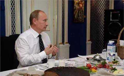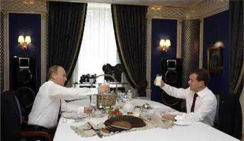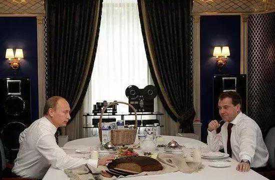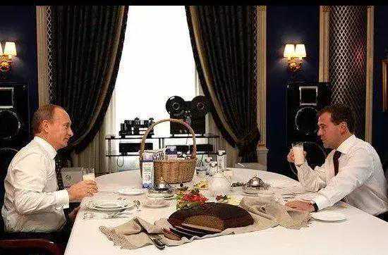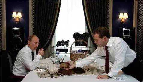 图为普京在参观完俄罗斯“今秋”农业博览会后,带着一些传统黑面包、牛奶和水果回往位于莫斯科郊外的“高尔基”总统官邸,准备与梅德韦杰夫共同品尝。于是两人举杯庆祝俄罗斯大丰收的照片就被张贴在官网之上,并迅速在民间流传开来。