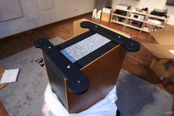 照片中为这次试听的VirgoIII底部实际照片,并没有使用陶瓷棉,而是改采碳纤维的箱体体座。另外还可以看到位于音箱下方的低音反射孔。