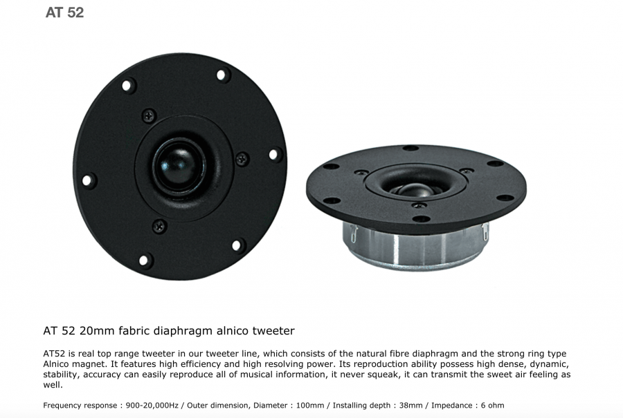 AT52是我们tweeter系列中真正的顶级tweeter,它由天然纤维隔膜和强环形Alnico磁铁组成。效率高,分辨率高。它的再现能力高、动态、稳定、准确,能轻松地再现所有的音乐信息,不会发出吱吱声,还能传递甜美的空气感。