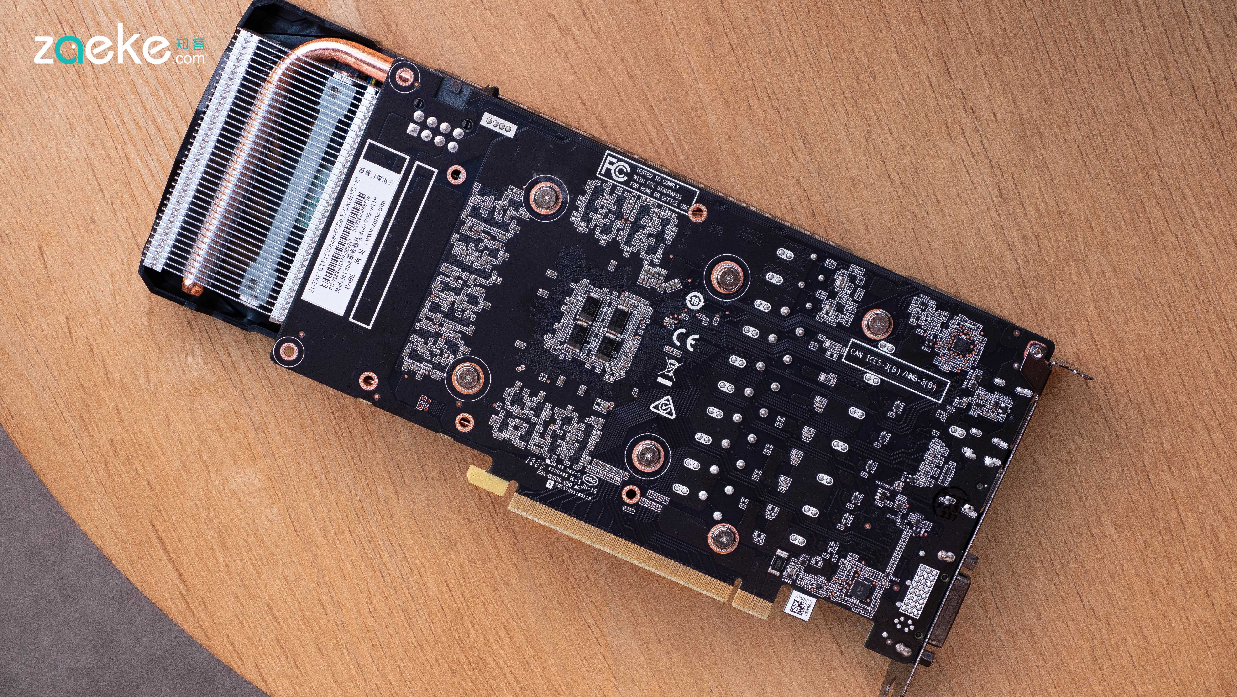 背面也与GTX1660无差,可以看出1660Super的PCB并不长,第三把风扇已经露出半截。比较可惜的是并没有加金属背板,看起来不太高档。